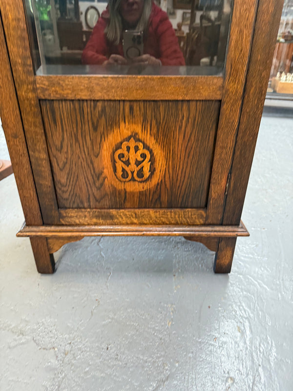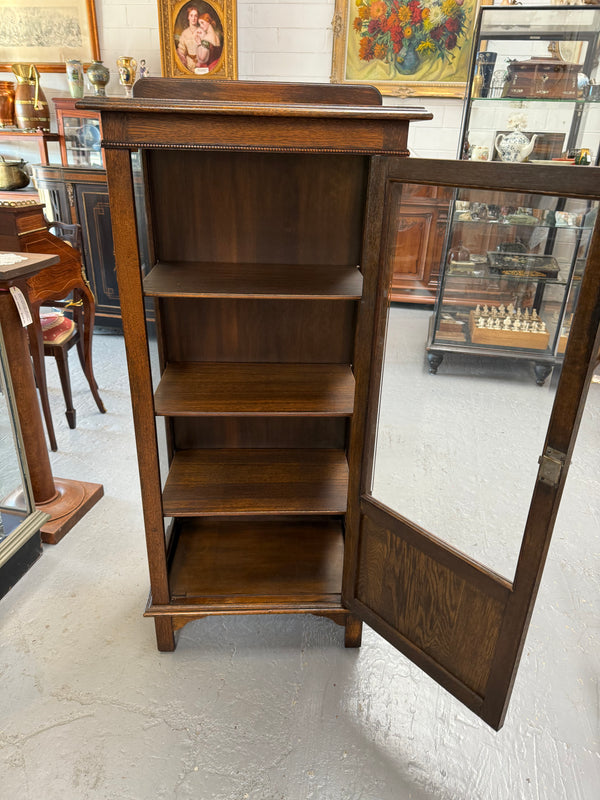 Petite Tudor style display cabinet of small proportions with bevelled glass and three timber shelves. In good original condition. Please see photos as they help to form part of the description and condition.