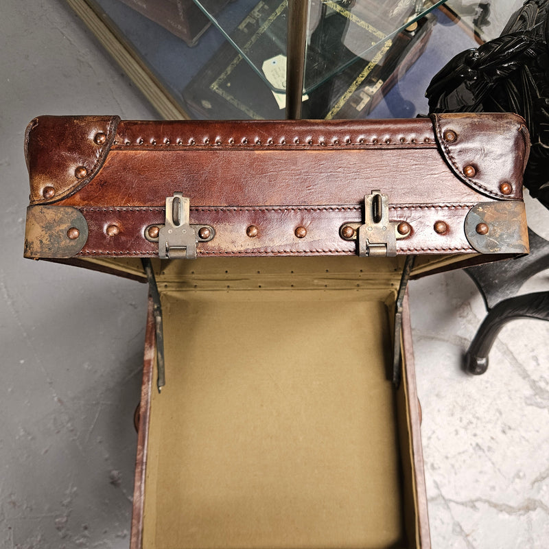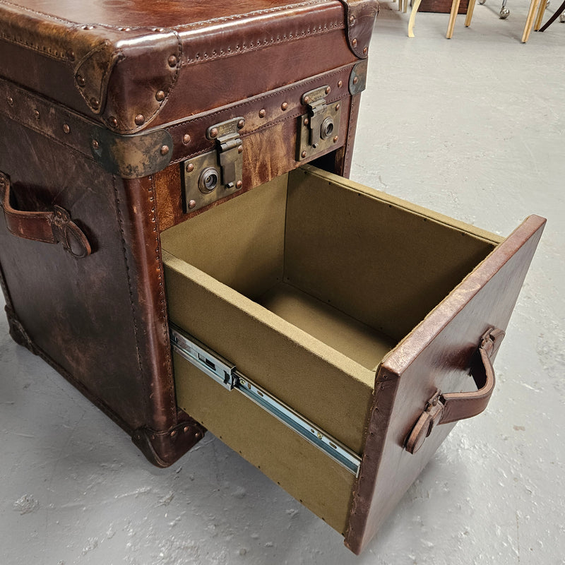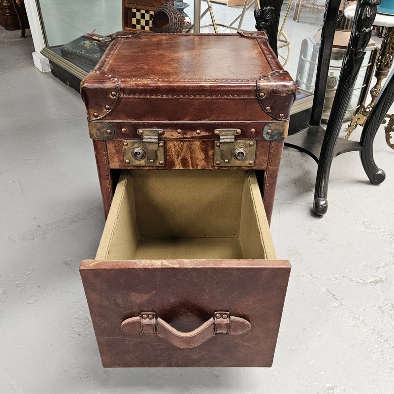 Unusual leather filing cabinet / side table. Consisting of 1 filing drawer and lift up top. In good original condition. Please see photos as they form part of the description.