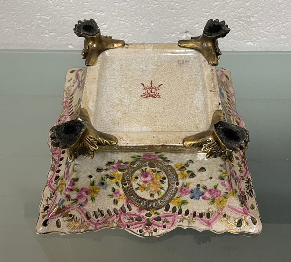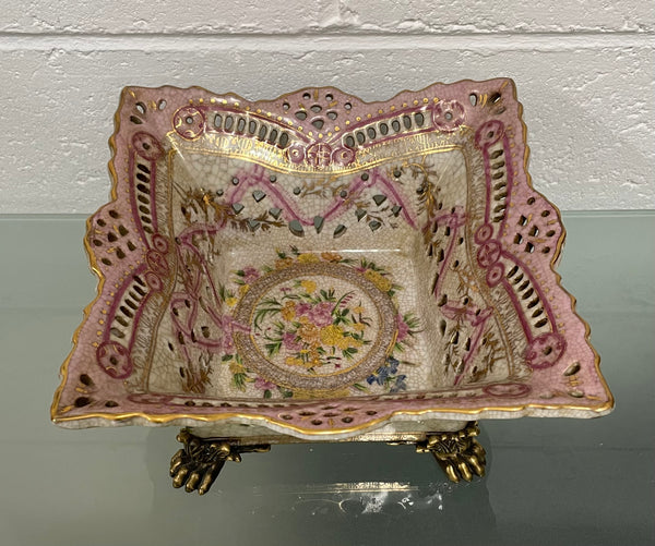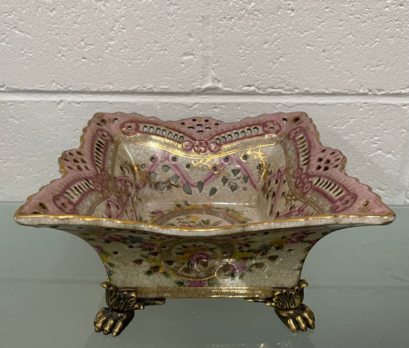 Decorative square bowl with floral details and gold highlights, sitting on gold feet and mainly pinks in colour. In good condition.
