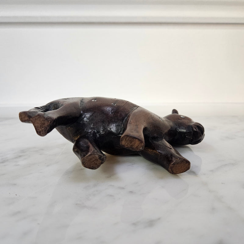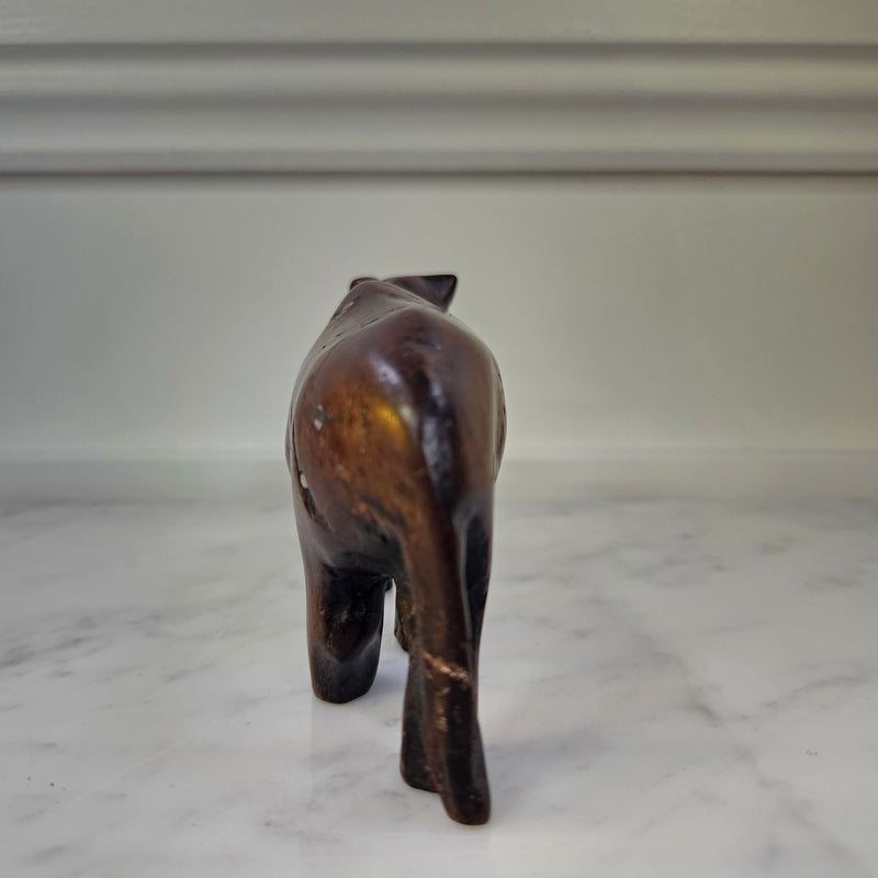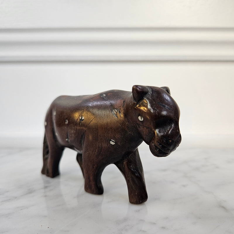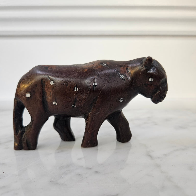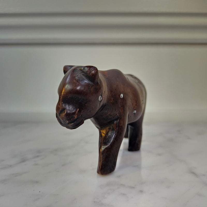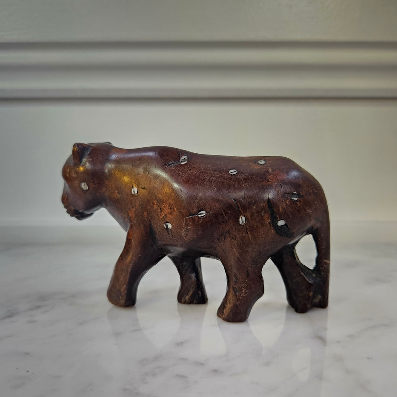 Primitive African lion carving with bone Inlay. In good original condition, please view photos as they help form part of the description.