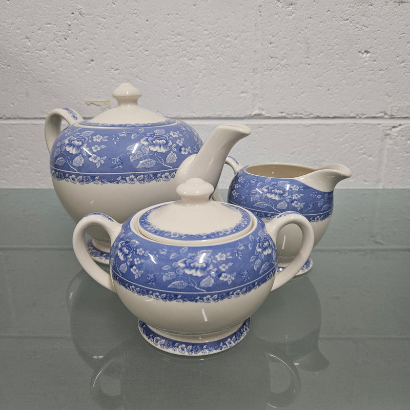 Very attractive blue and cream pattern "Albertine" Queens English 3 piece tea set; Teapot, Sugar and Creamer. In very good condition. Please see photos as they form part of the description.