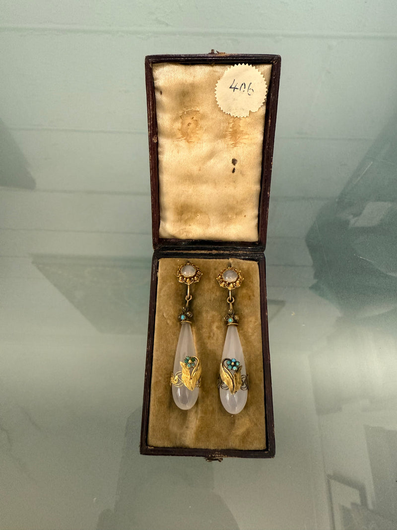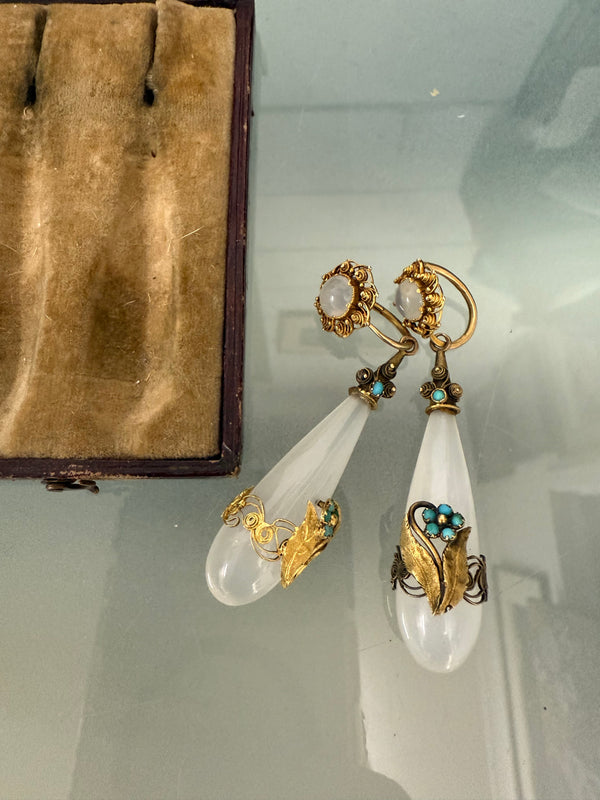 Rare 15ct three colour gold set with Chalcedony and Turquoise and acorn detail drop earrings. In original box. Ing ood o riginal condition. Please see photos as they form part of the description.