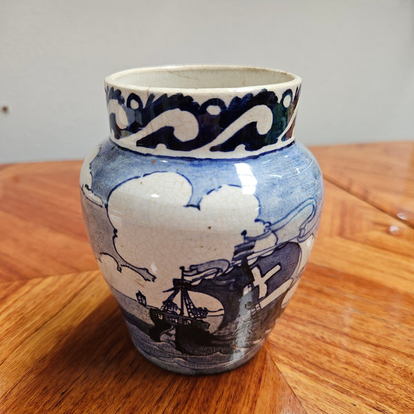 Rare Australian pottery signed "M. Moroney Brisbane 11.3.1908" hand painted vase featuring Spanish Galleons in a rough sea, Small hairline to lip of vase. Please see photos as they form part of the description.