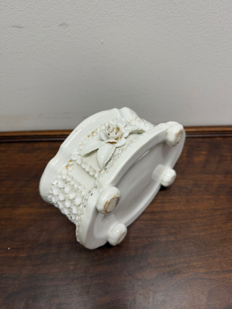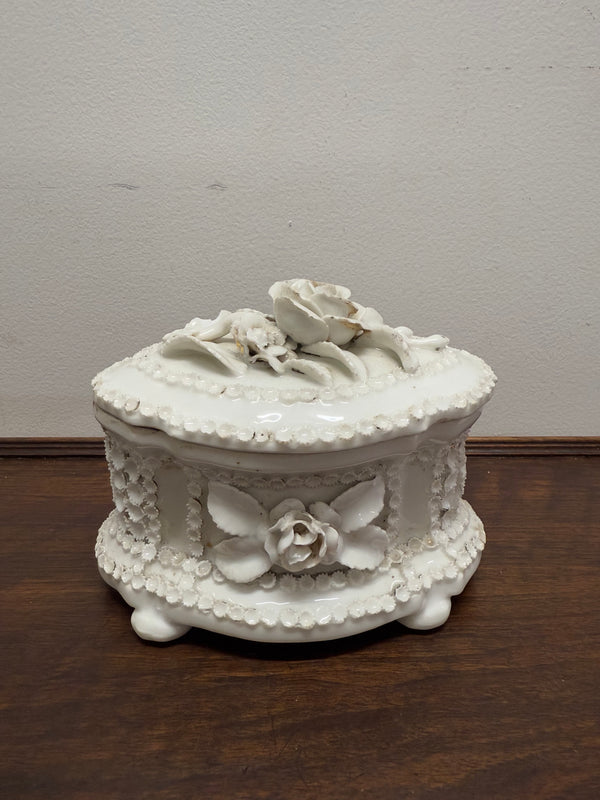 Circa 1800's rare German fairing trinket box in white porcelain with floral design. It is in as found condition with some parts of the floral chipped but not very noticeable. Please see photos as they form part of the description.