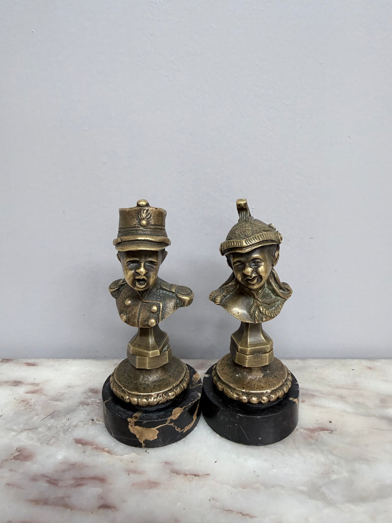 Rare Pair of bronze Napoleon III children busts on marble bases wearing military uniforms, one child wearing uniform of French infantry 1870/71, the other child is wearing the guard cuirassiers from the same period during France Russian War. They are in excellent condition. Please see photos as they form part of the description.
