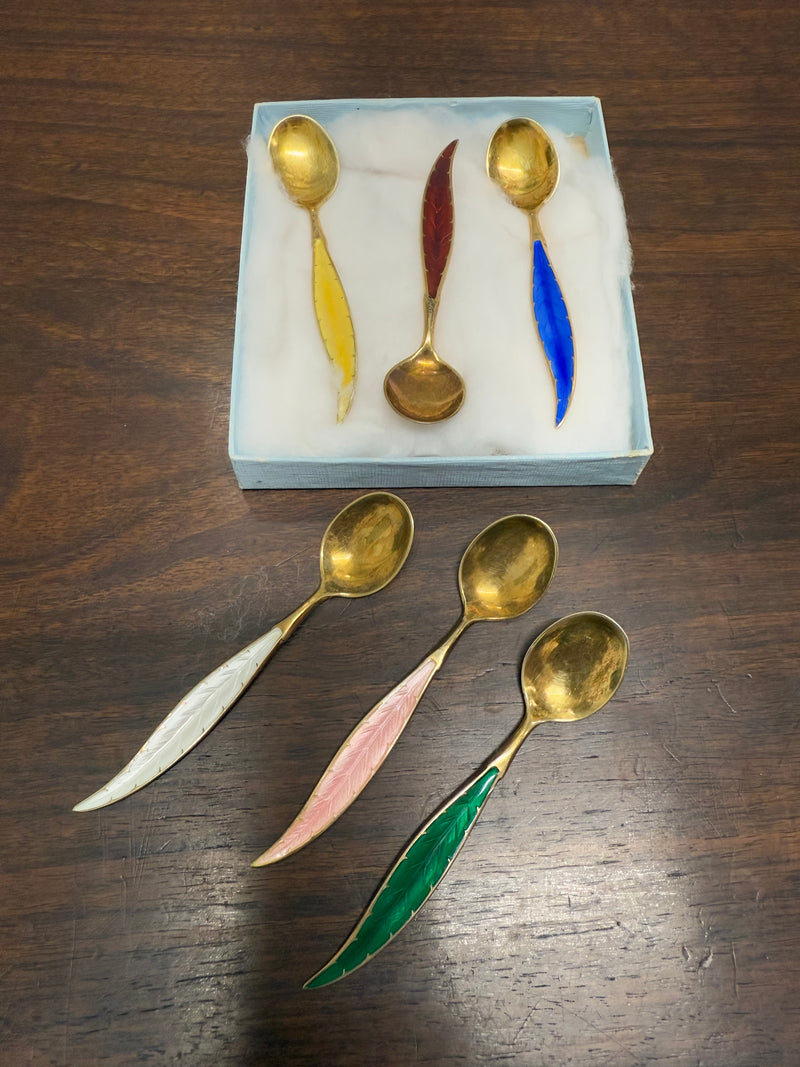 Rare Set 6 Norwegian Sterling Silver & Guilloche Enamel Feather Spoons