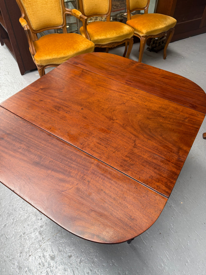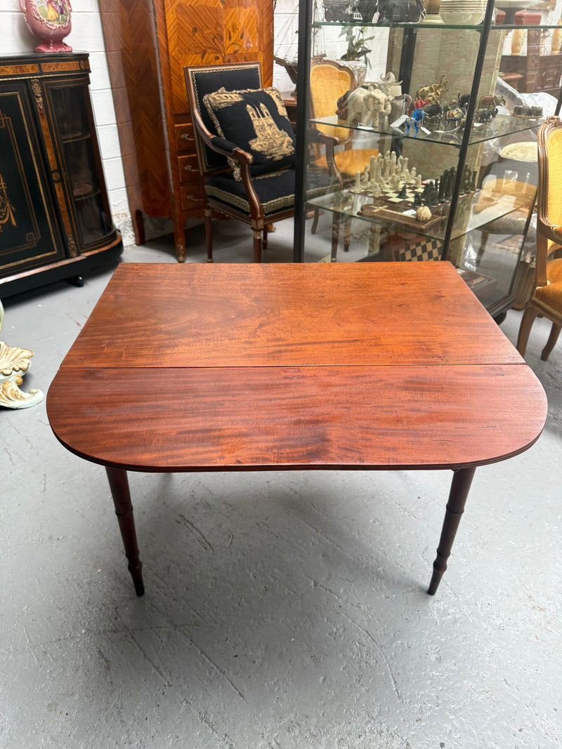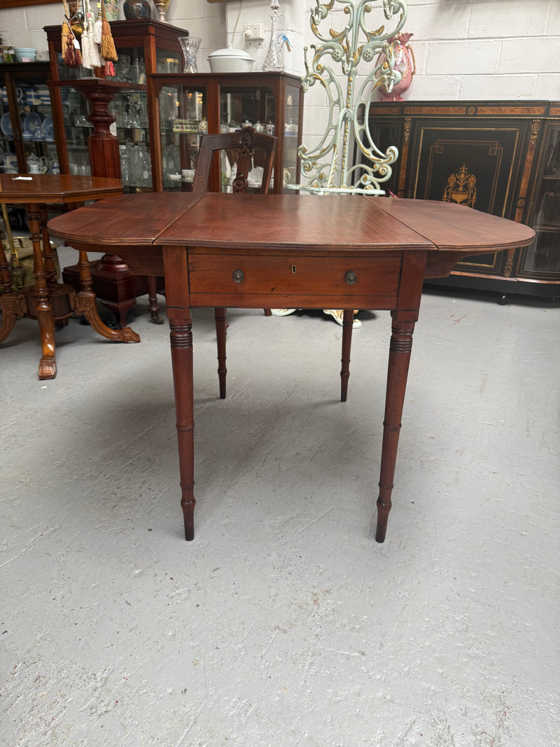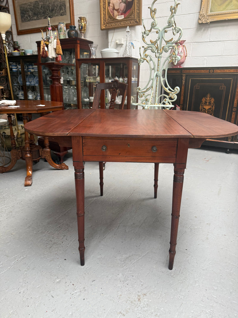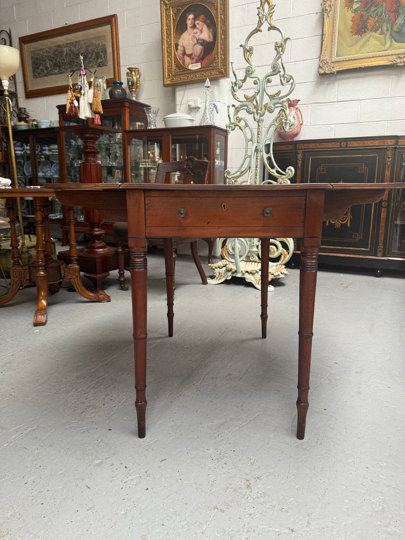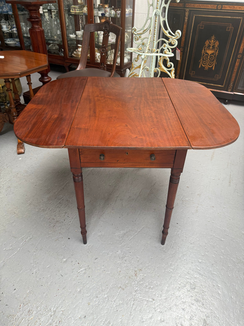Good quality Regency mahogany Pembroke table. It has two drop leaves above a single drawer to the front and a faux drawer to the rear. Standing on turned tapering reeded legs. In good original condition. Please see photos as they form part of the description and condition. Table measures 97 cm when open and 50 cm when sides are dropped.