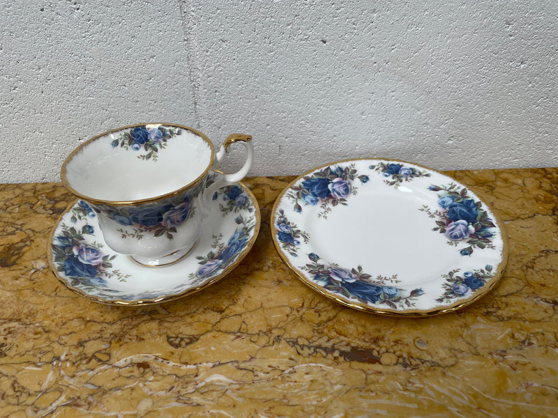 Royal Albert "Moonlight Rose" Trio set, cup, saucer and tea plate. In good original condition made in England with stamp on base. Please view photos as they help to form part of the description and condition.