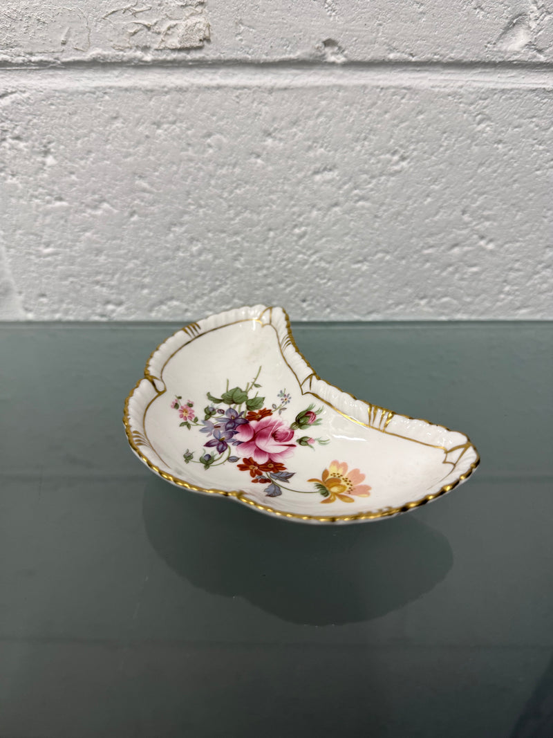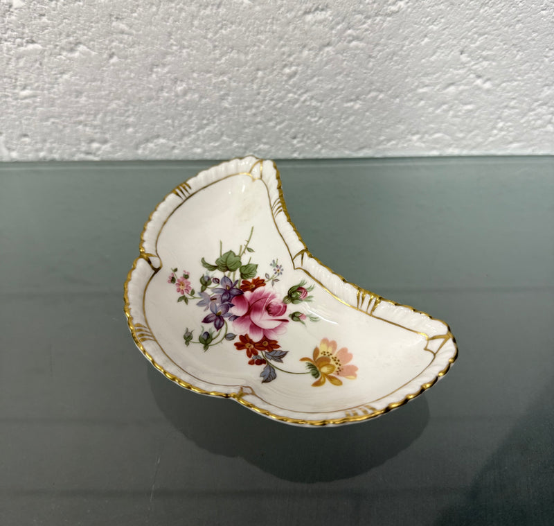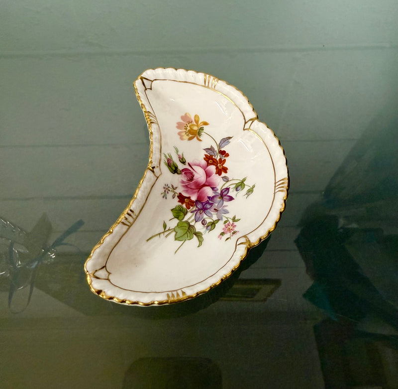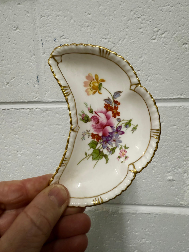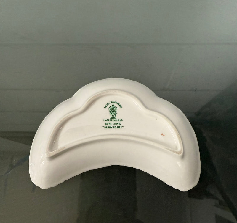 Very pretty Royal Crown Derby "posies" crescent shaped trinket dish. In good original condition. Please see photos as they form part of the description.