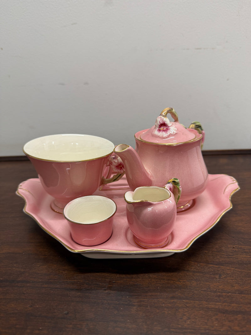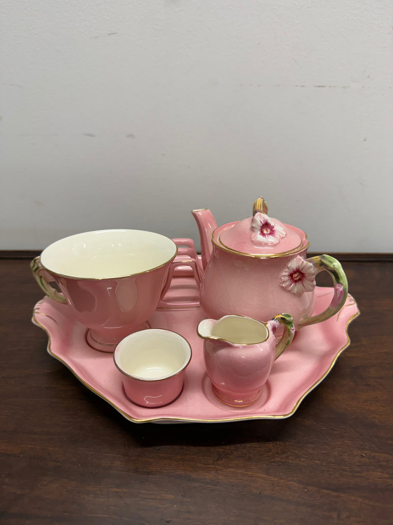 Lovely Royal Winton pink Petunia breakfast set with a cup, toast rack, coffee and milk jug. and sugar cup. It is in good original condition. Please see photos as they form part of the description.