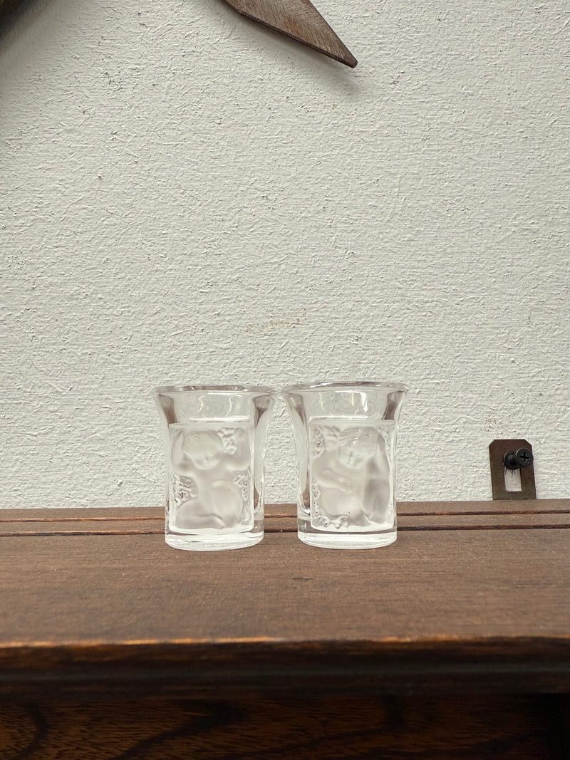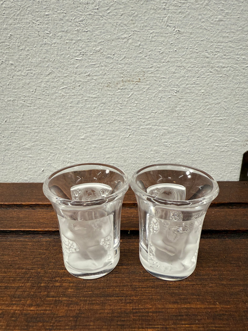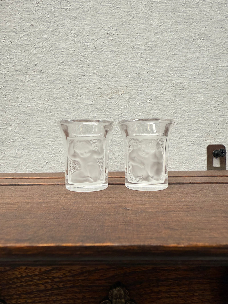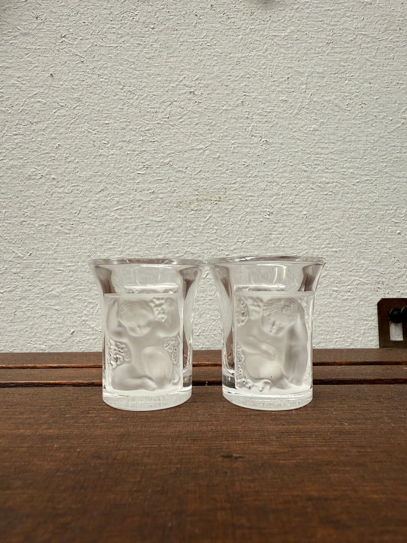 Fabulous set of two Lalique "Enfant" decorative shot glasses in very good condition. Please see all photos as they form part of the description and condition.