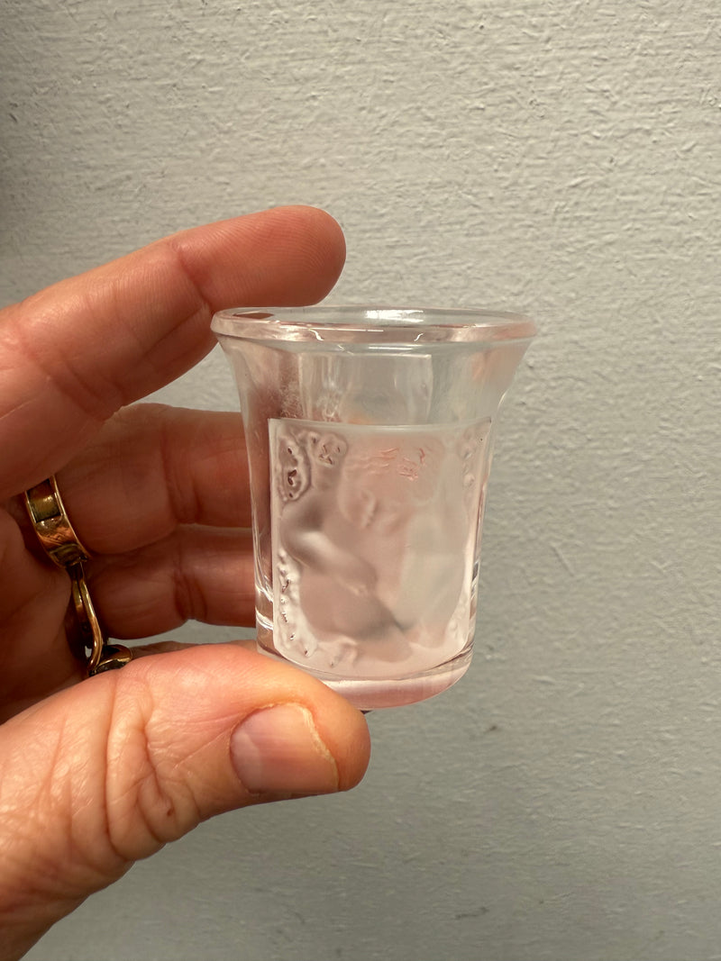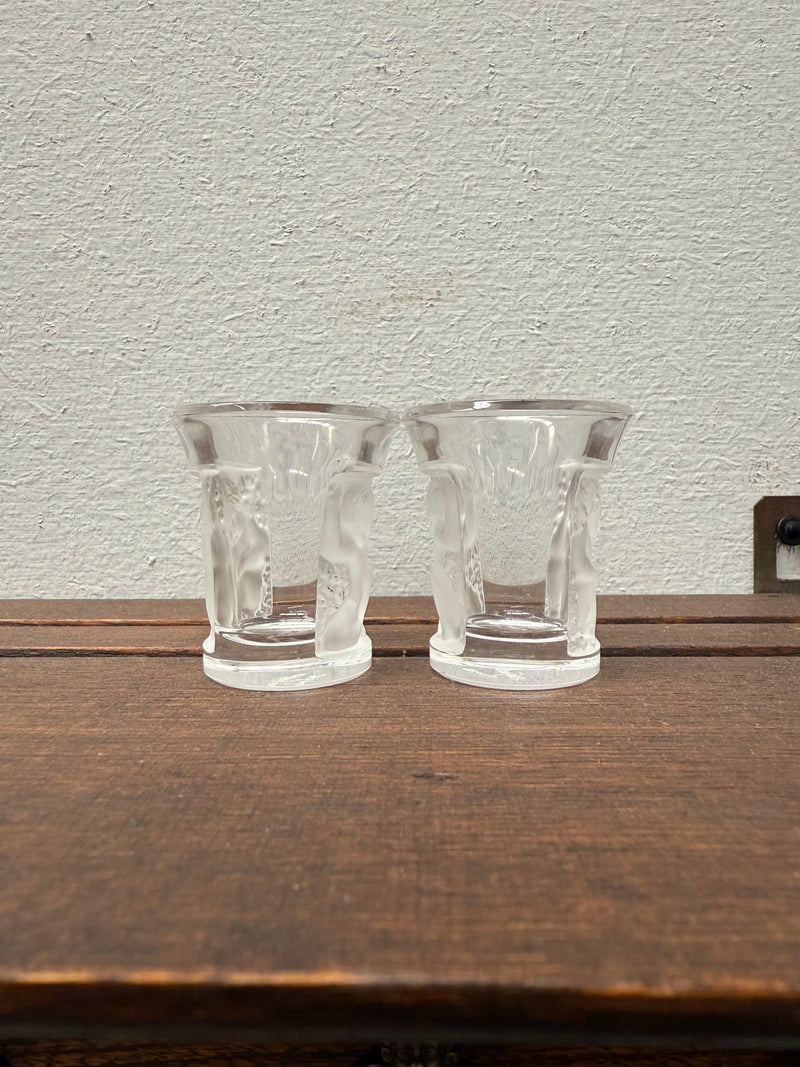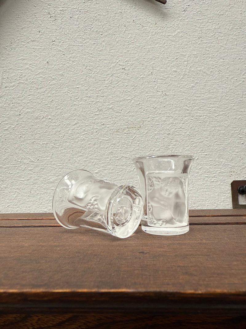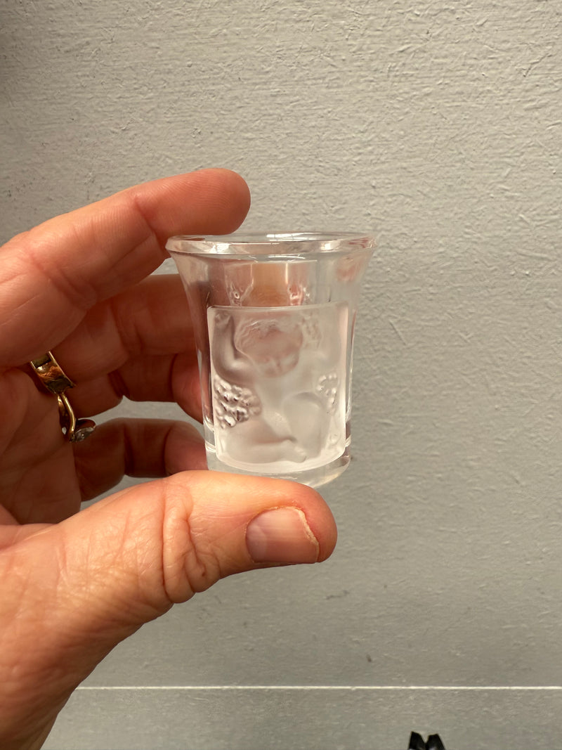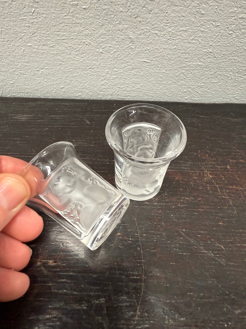 Fabulous set of two Lalique "Enfant" decorative shot glasses in very good condition. Please see all photos as they form part of the description and condition.
