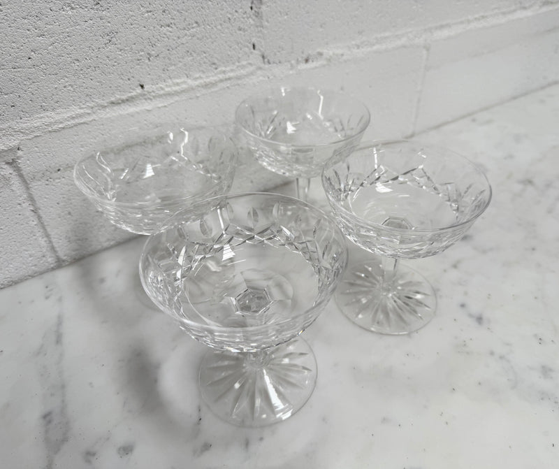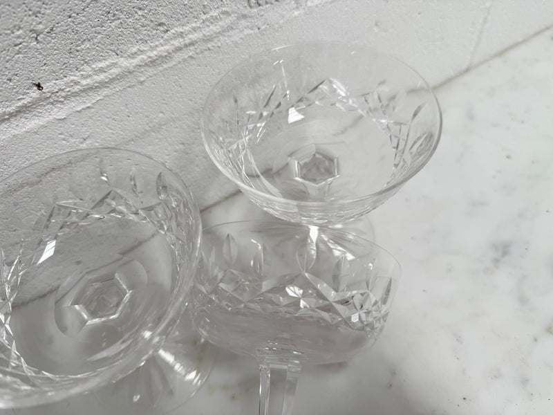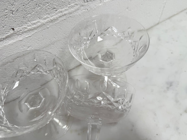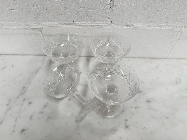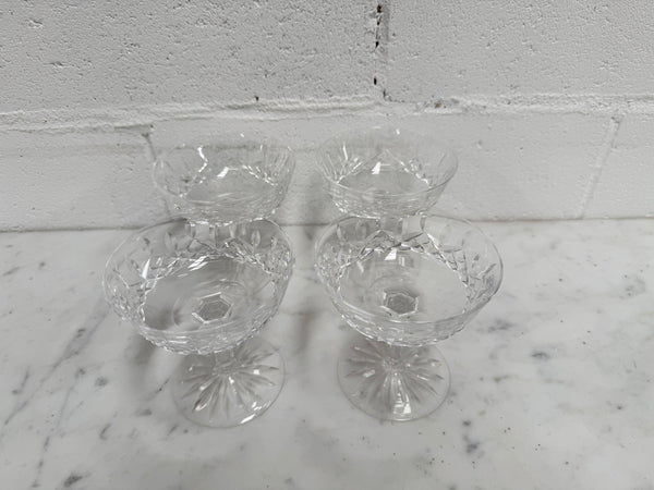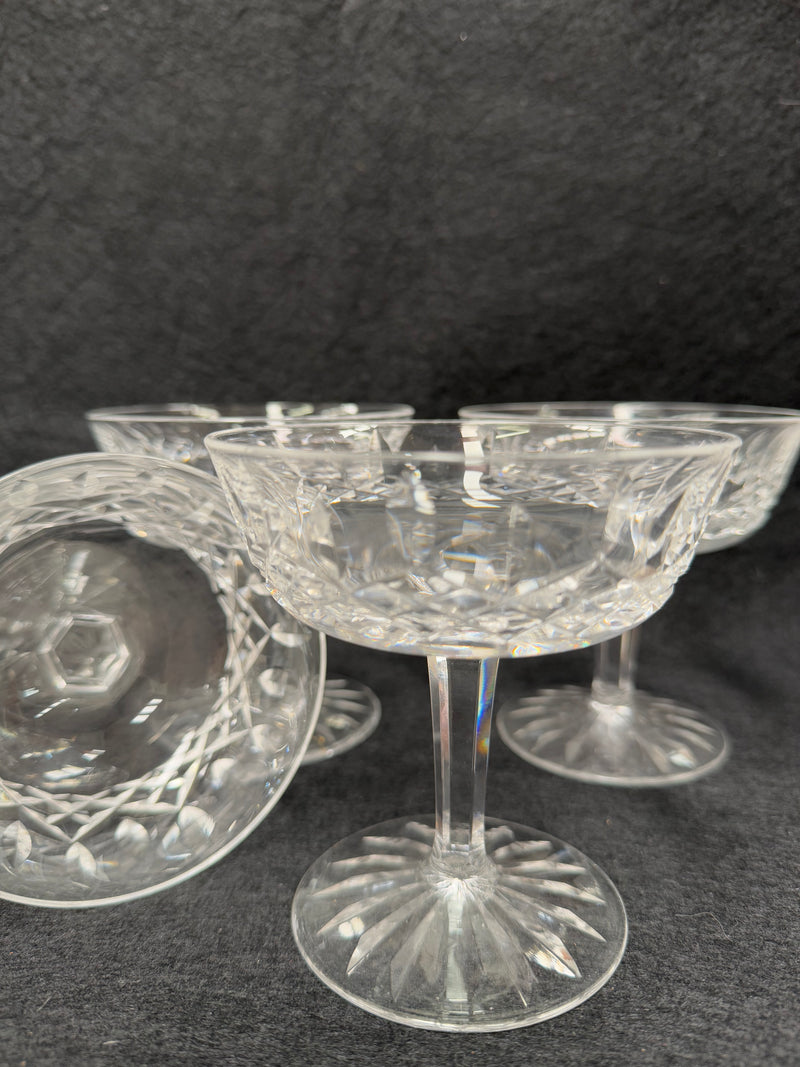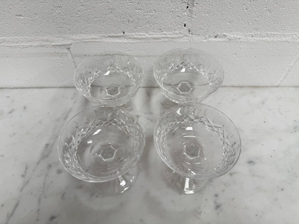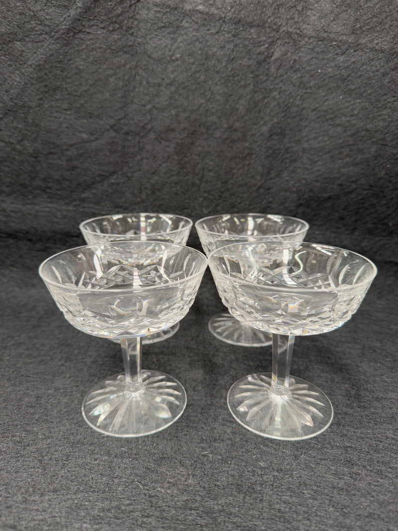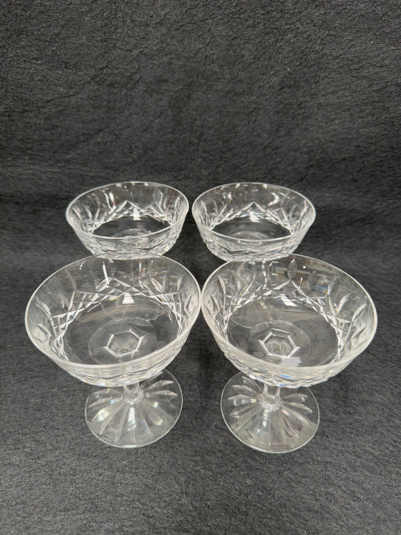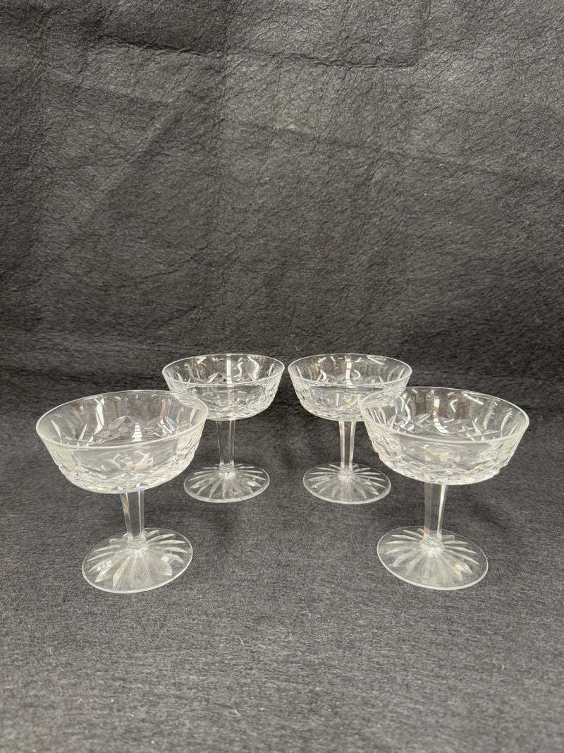 Set of 4 vintage Waterford crystal champagne/sherbet coupe glasses with the Lismore pattern. They are all in good original condition with no chips or cracks. Please view photos as they help to form part of the description and condition.