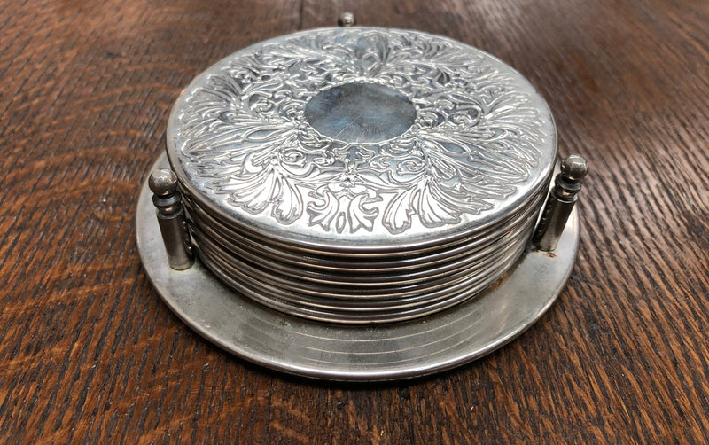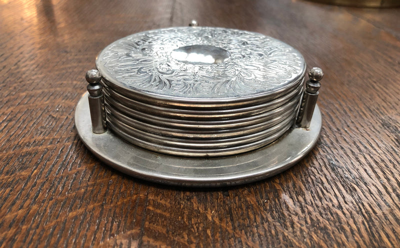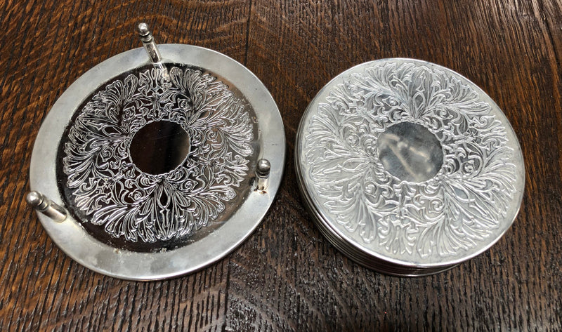 Beautiful set of 6 silver plate coasters in a lovely holder and in good condition.