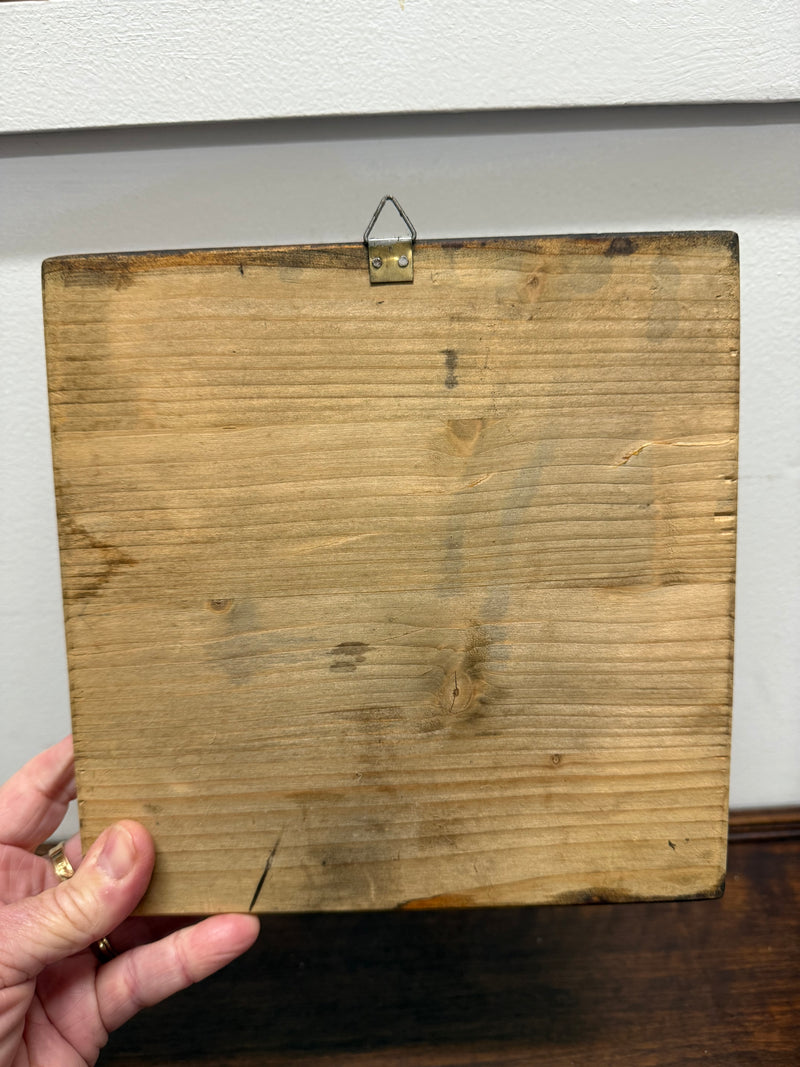 Hand painted Spanish Majolica tile signed 'Flight into Egypt'. It is in good original condition with some crazing. Please see photos as they form part of the description.