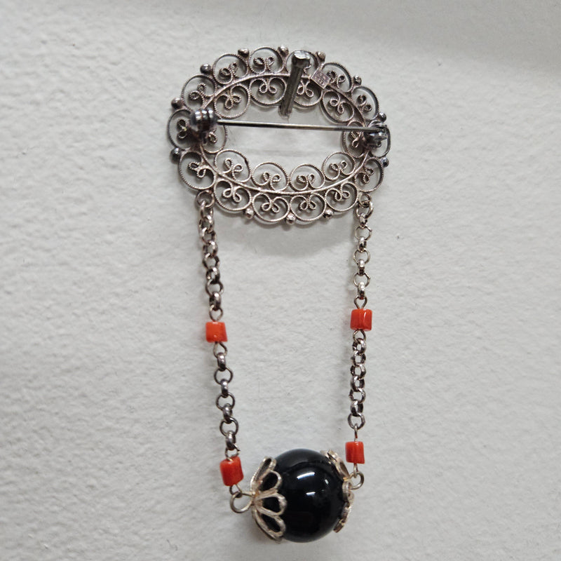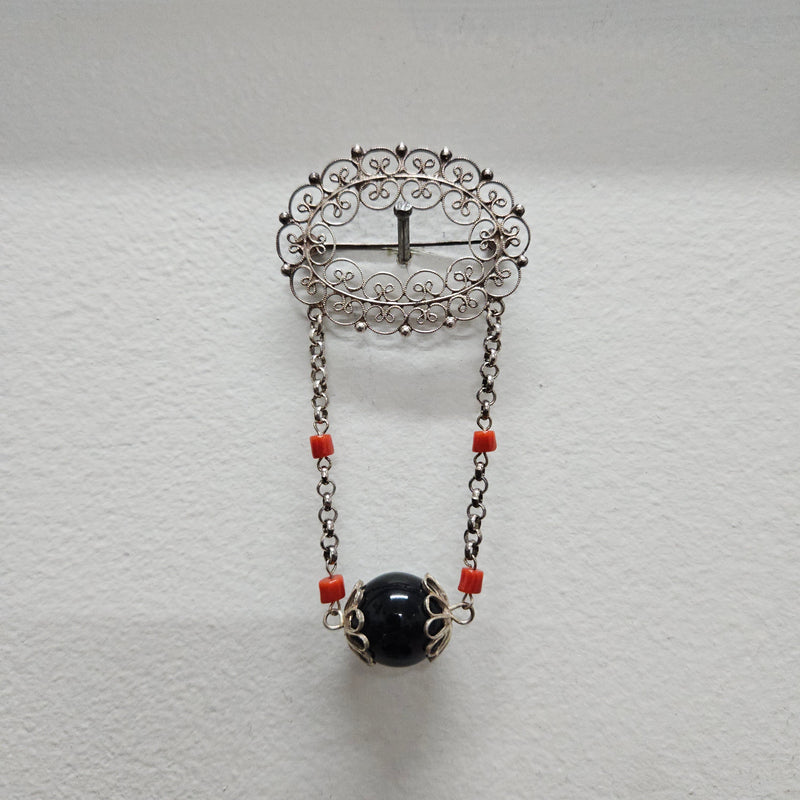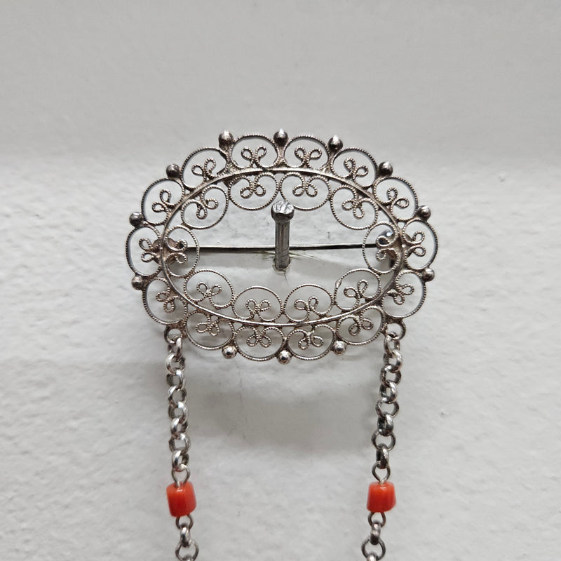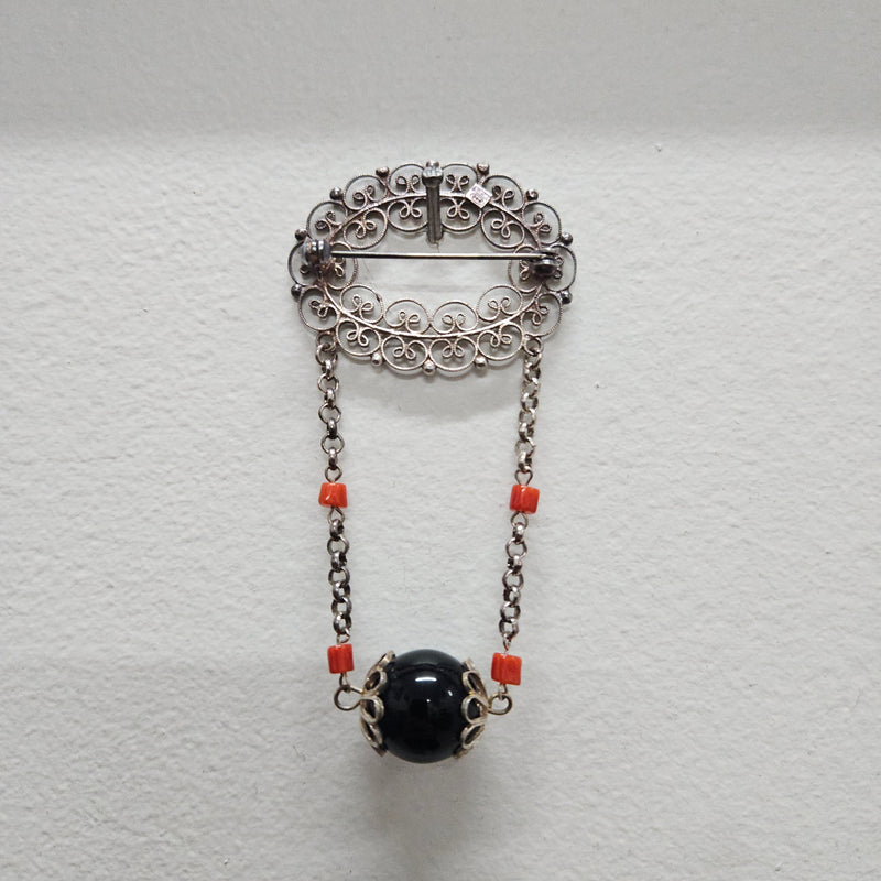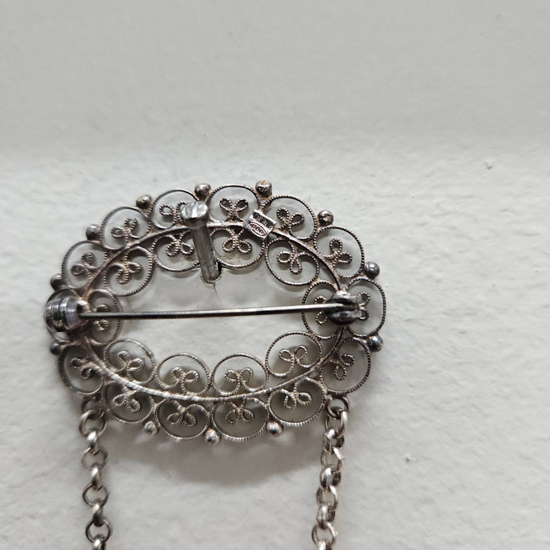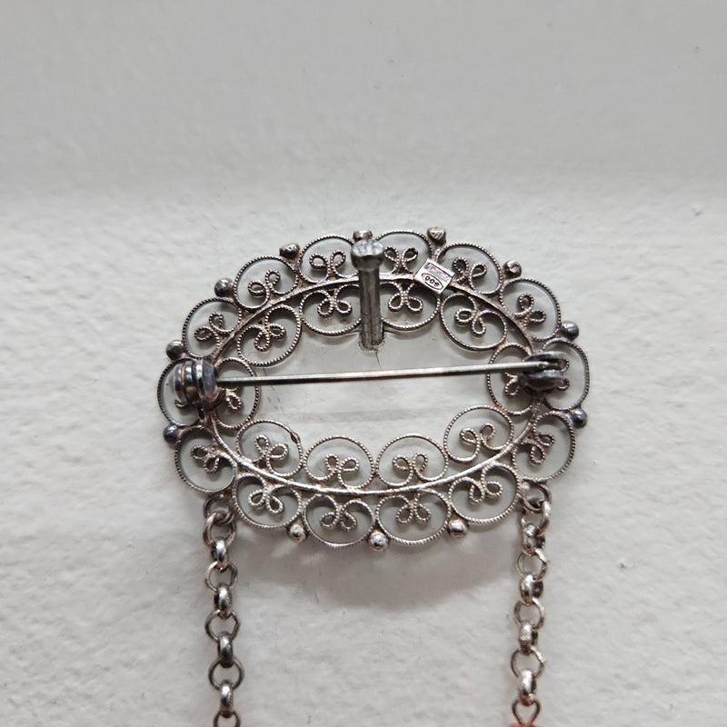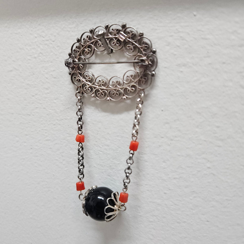 Silver Filigree And Bead Brooch