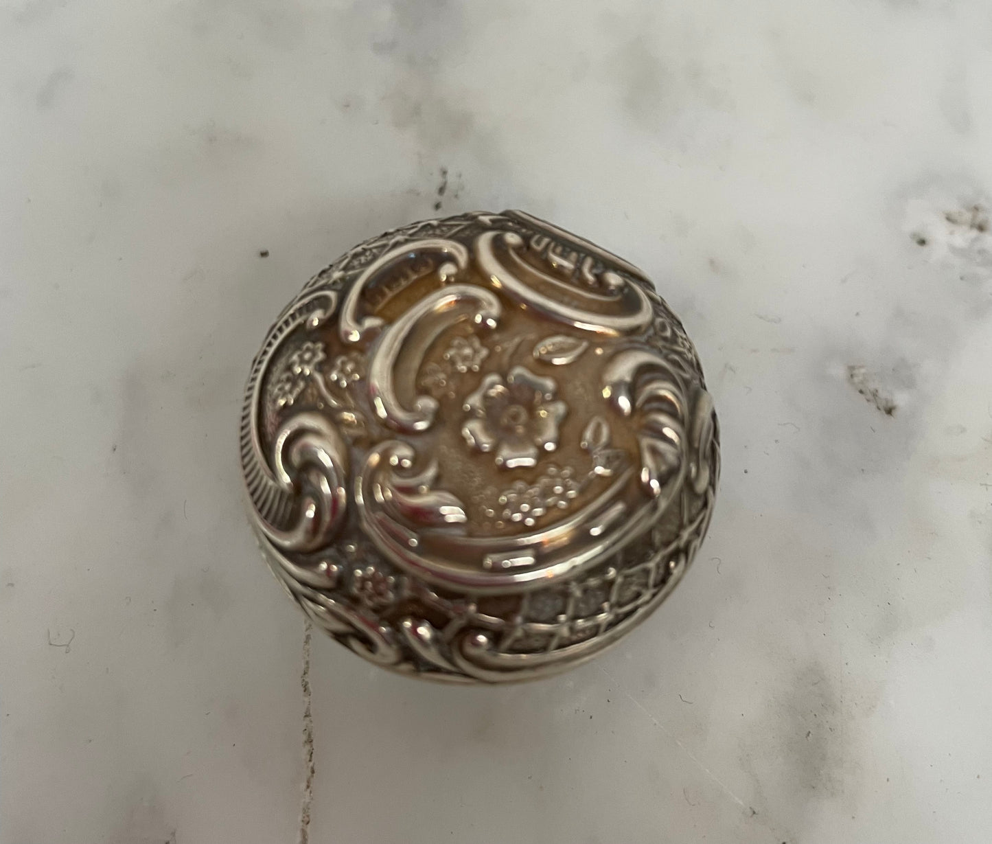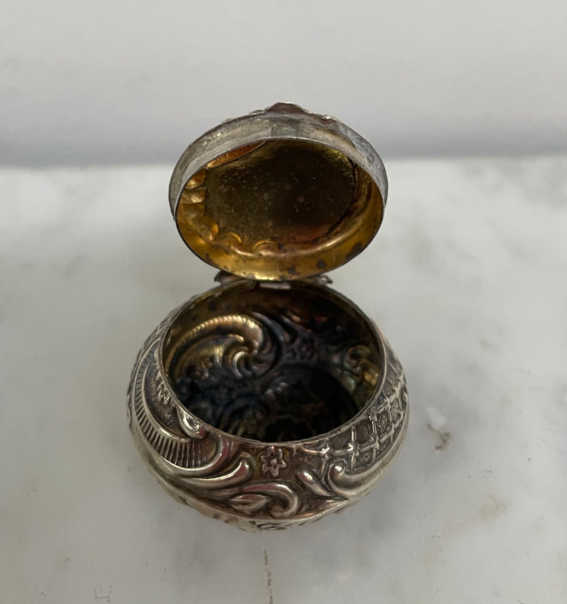 Charming repousse silver pill box Birmingham 1905 with hinged lid. Please see photos as they form part of the description.
