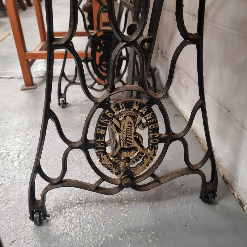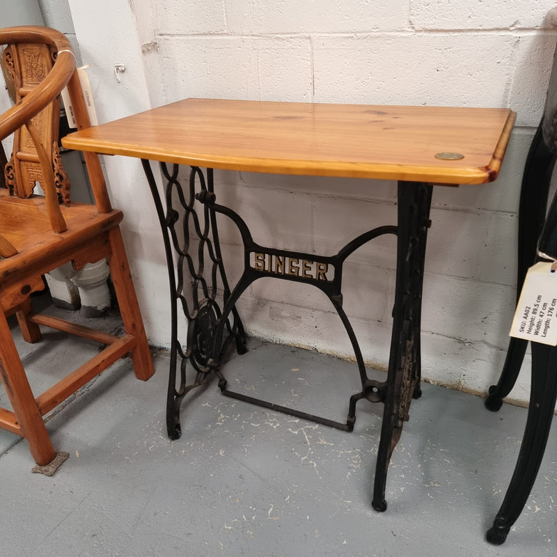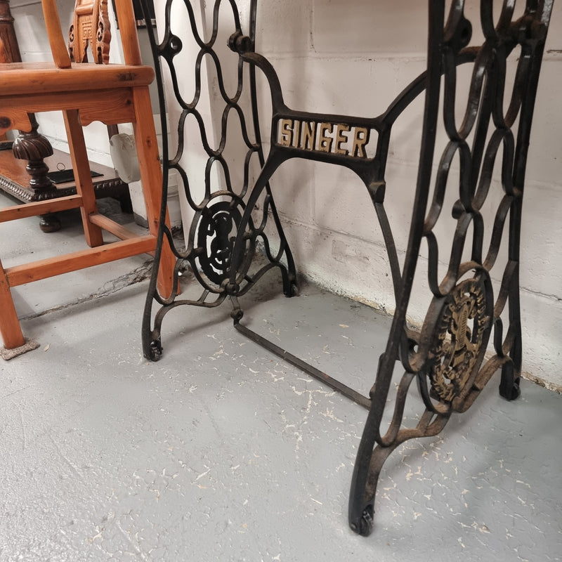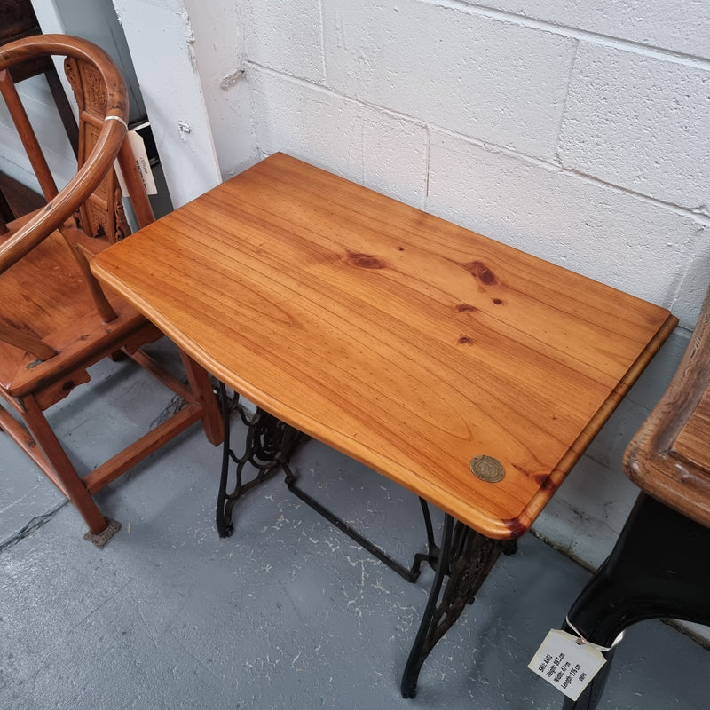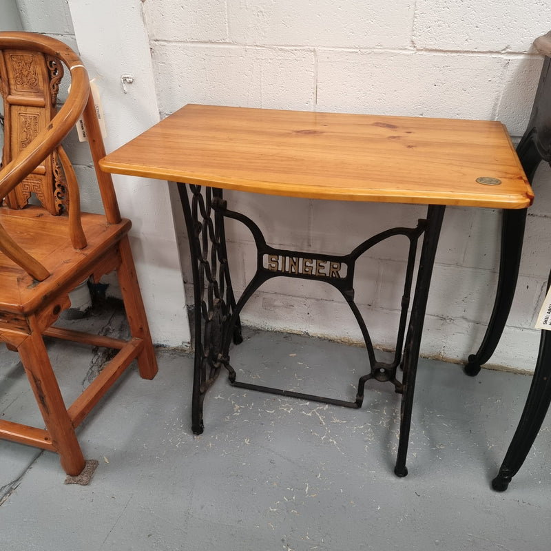 Singer 150 year anniversary treadle sewing machine base with a pine top and anniversary plaque. The base is made from cast iron and the top is pine timber. It has been sourced locally and is in good original detailed condition. Please view photos as they help to form part of the description and condition.