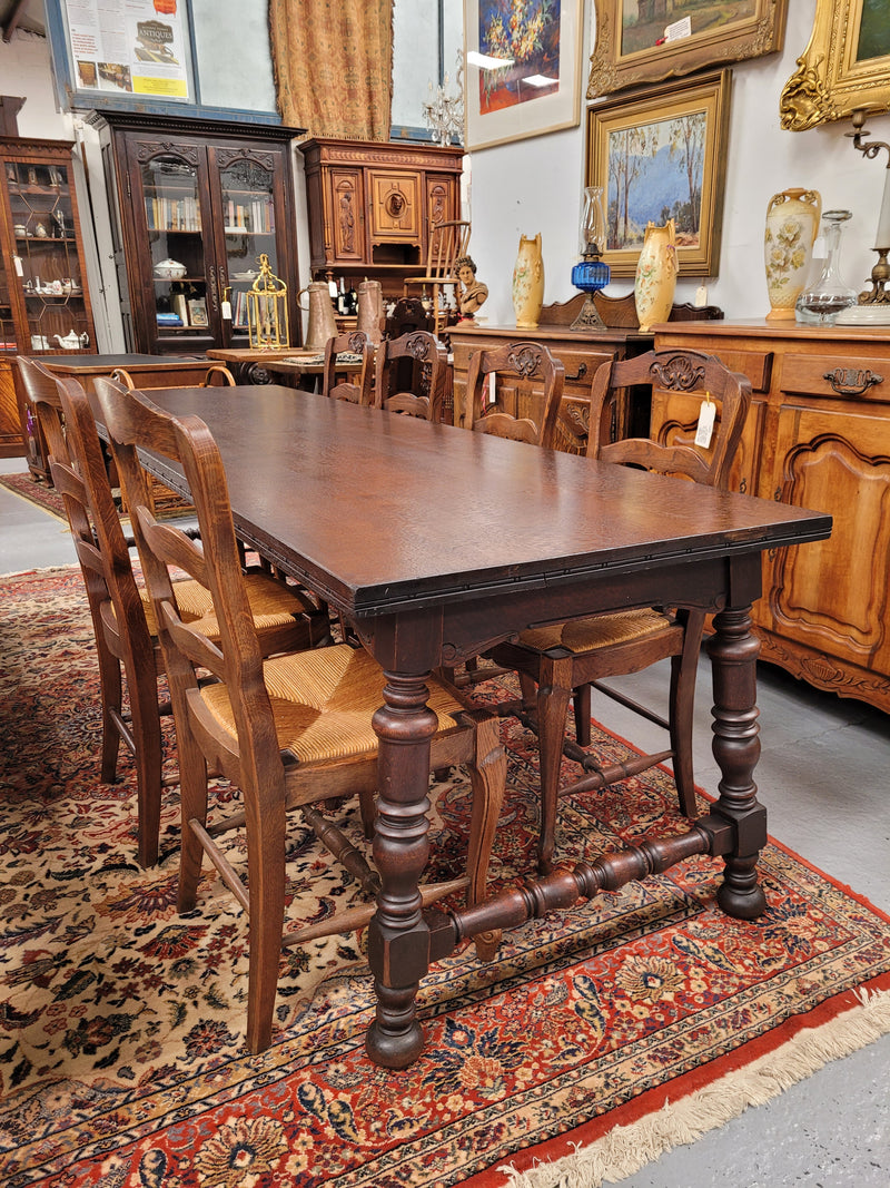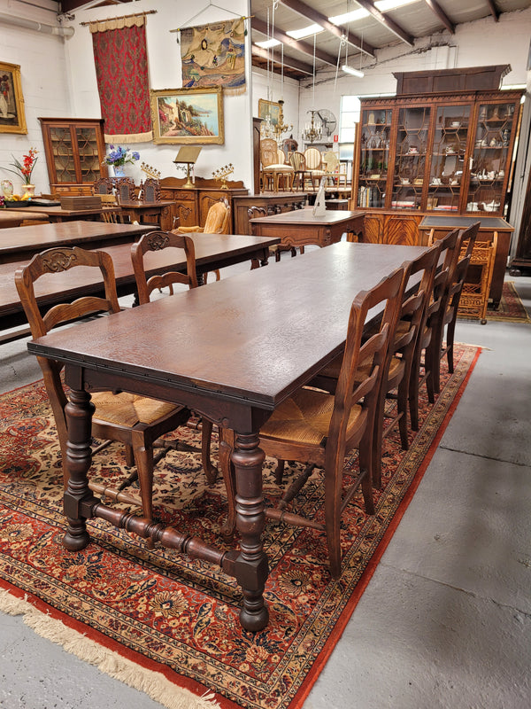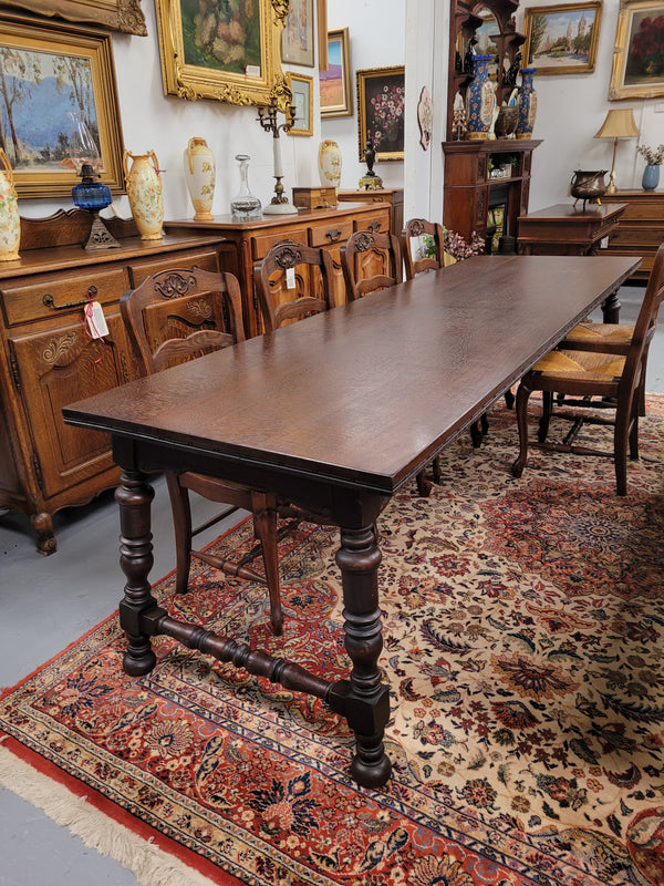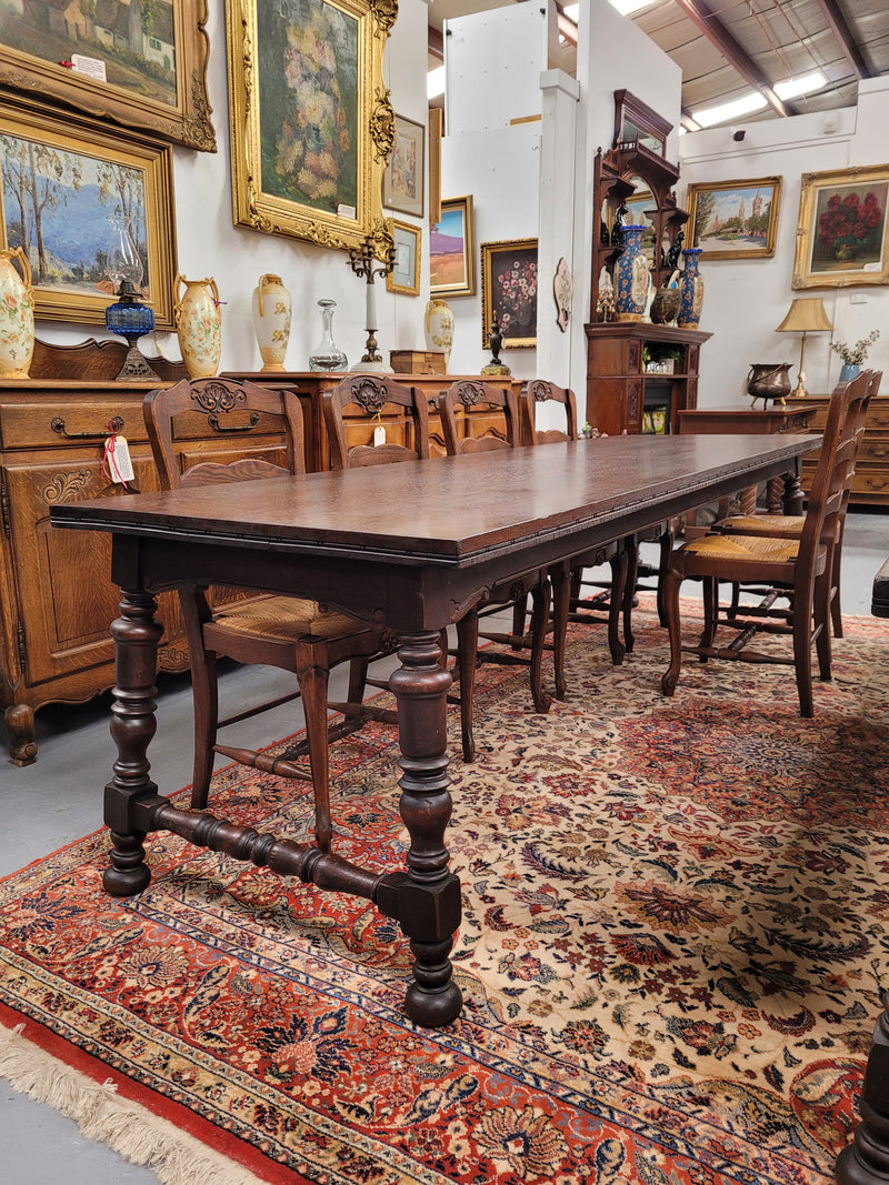 Just arrived a 274.5 cm long Silky Oak Spanish style refectory dining table. It can comfortably sit 8-10 people and has been sourced from France. This table is one of two we currently have for sale and is a very hard to find size and even harder to find a pair. If the two tables are placed end to end they can be used as an impressive 549 cm table. It is in good original detailed condition. *Please note price is for one table.