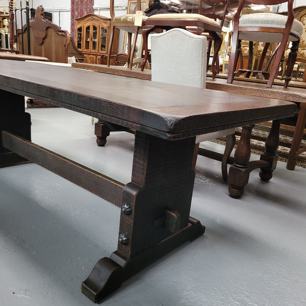 Stunning French dark Oak refectory style dining table. The base of the table features rustic charm and the top of the table features beautiful French oak grain. It has been sourced from France and is in good original detailed condition.
