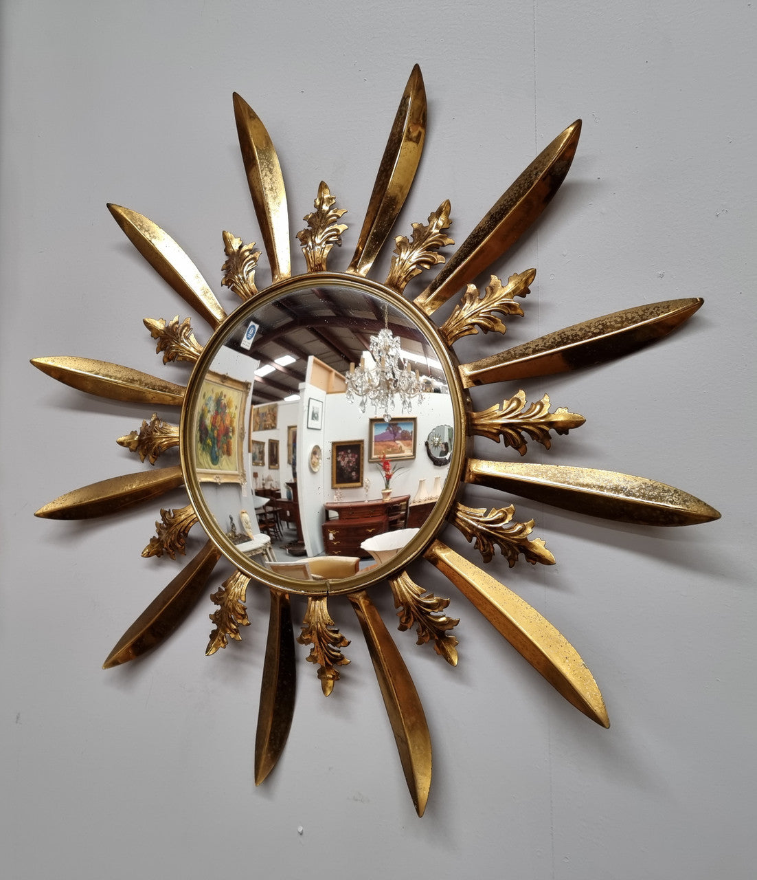 Stunning French Vintage gilt metal starburst convex mirror. It has been sourced from France and in good original detailed condition. Please note mirror does have some spotting due to age but only adds to its character.
