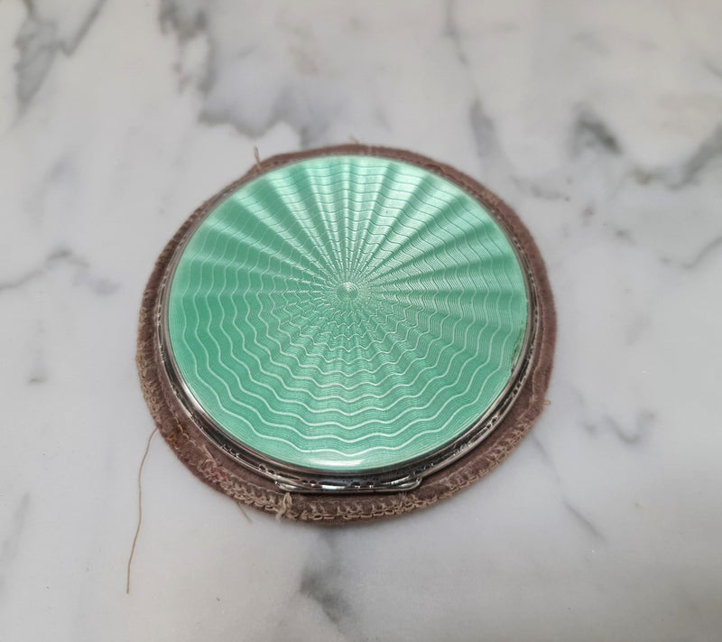 This beautiful sterling silver compact with interior mirror has a stunning mint green guilloche top in very good condition . It is marked "Birmingham 1937".