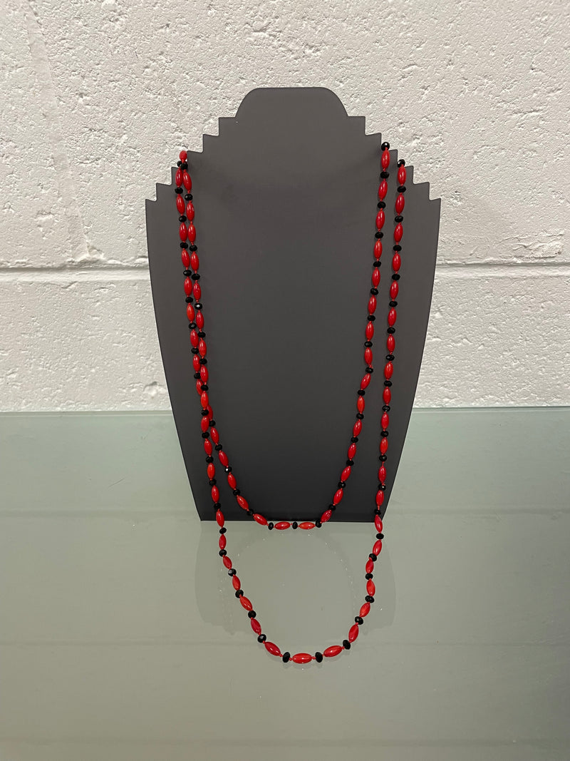 Stylish Jet Glass & Red Glass Bead Necklace Opera Length