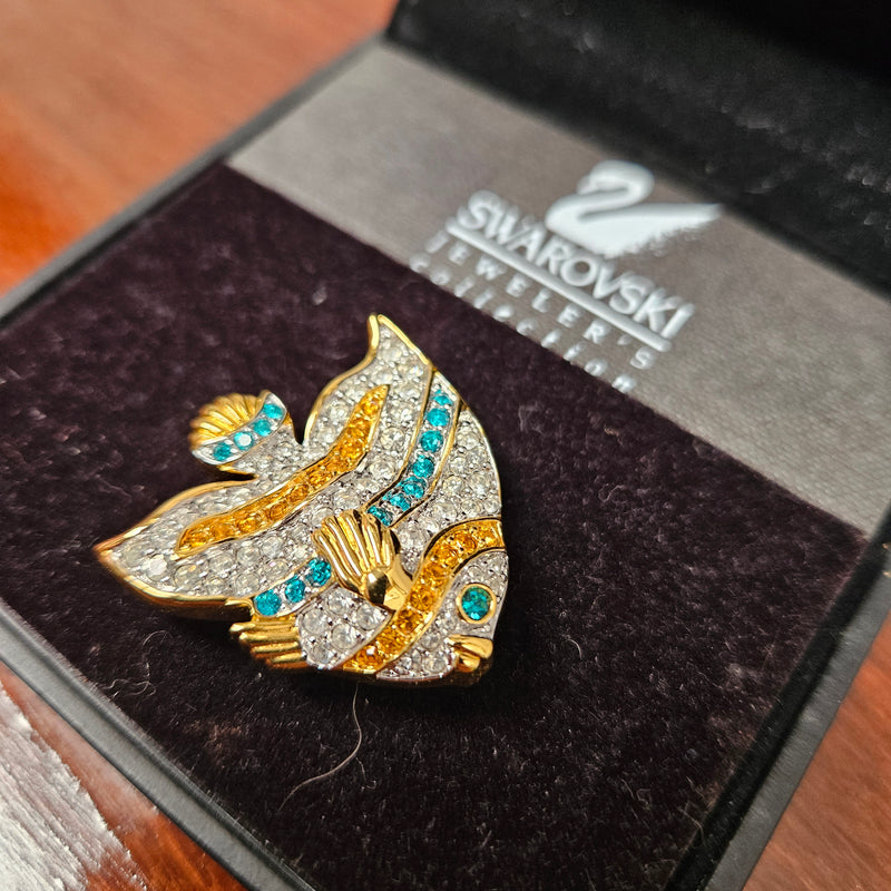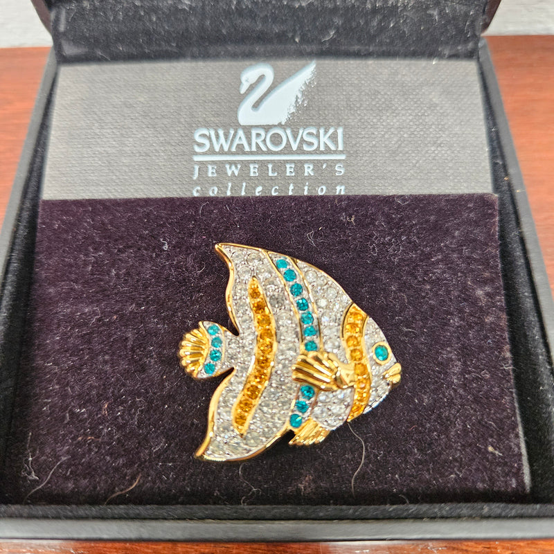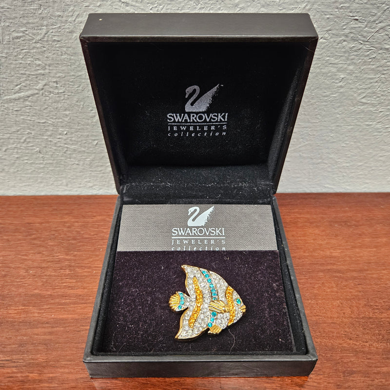 Vintage Swarovski with clear, Amber and Blue Crystals. It has its original Box and is signed on the rear with the Swarovski swan. In very good condition. Please see photos as they form part of the description.