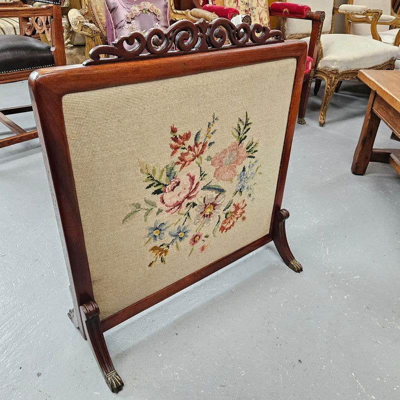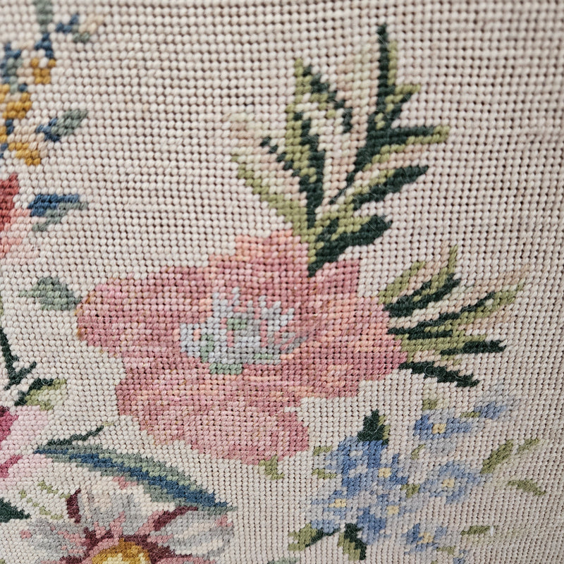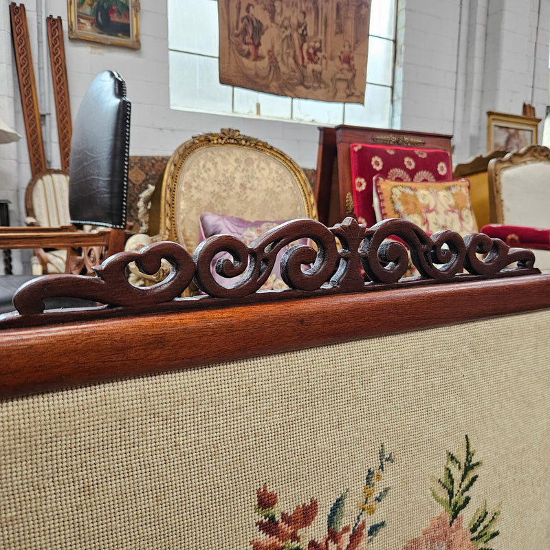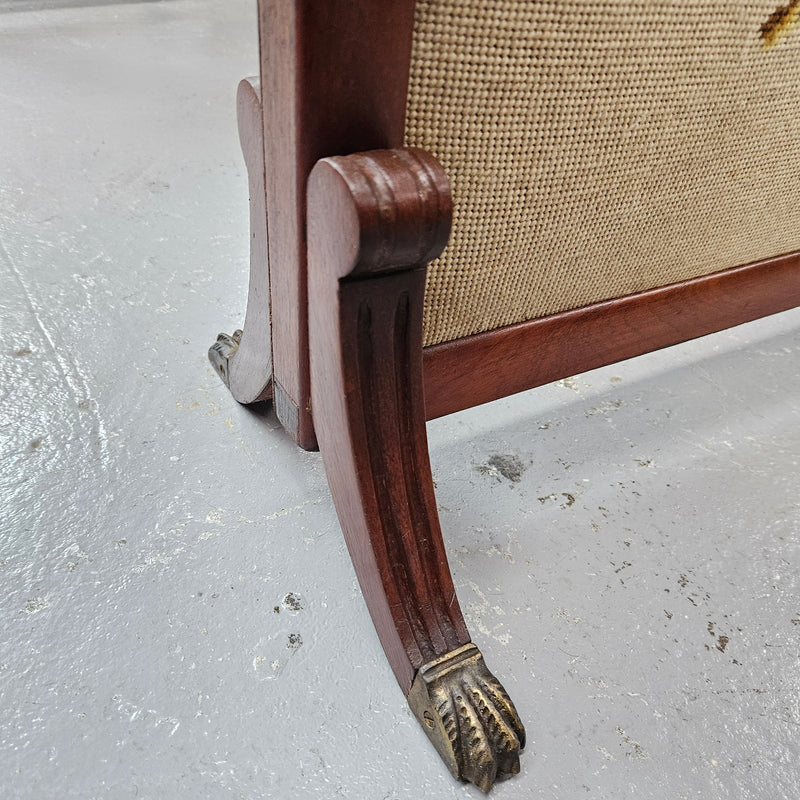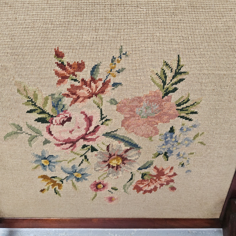 Beautiful floral tapestry detailed Mahogany wooden framed with brass details on the feet. It is in good original condition. Please see photos as they form part of the description.