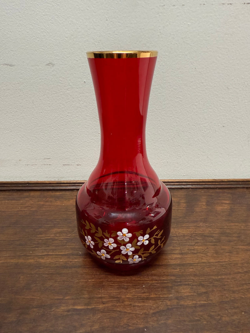 Lovely ruby and gilt rimmed glass vintage vase, it is in good original condition. Please see photos as they form part of the description.