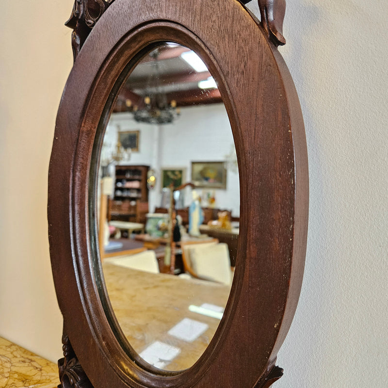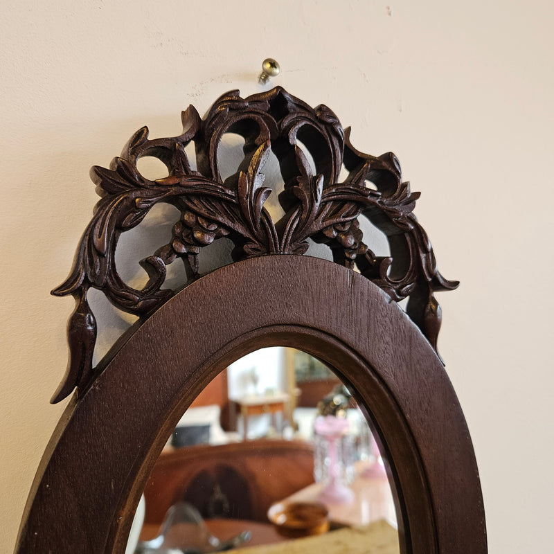 Lovely vintage oval wall mirror with carved decorative details in good condition. Please view photos as they help form part of the description.