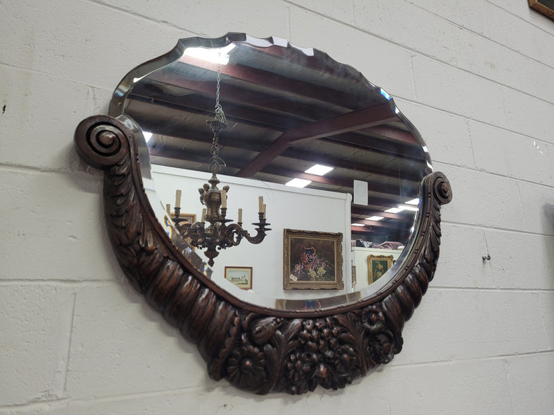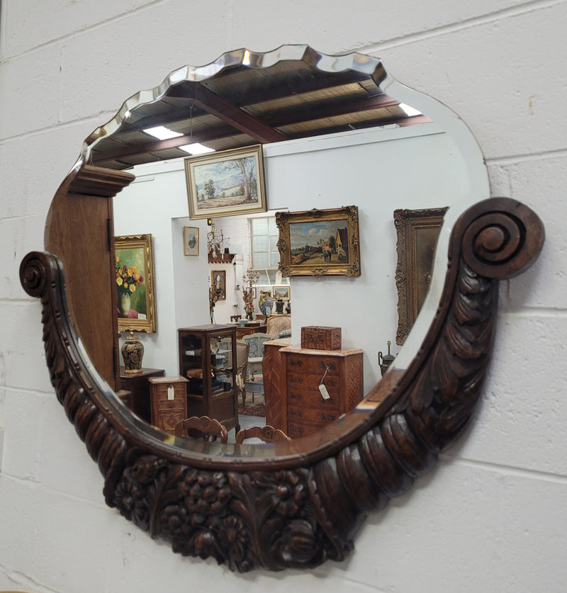 Unusual Art Deco Shaped & Bevelled Mirror Half Framed with Carved Oak