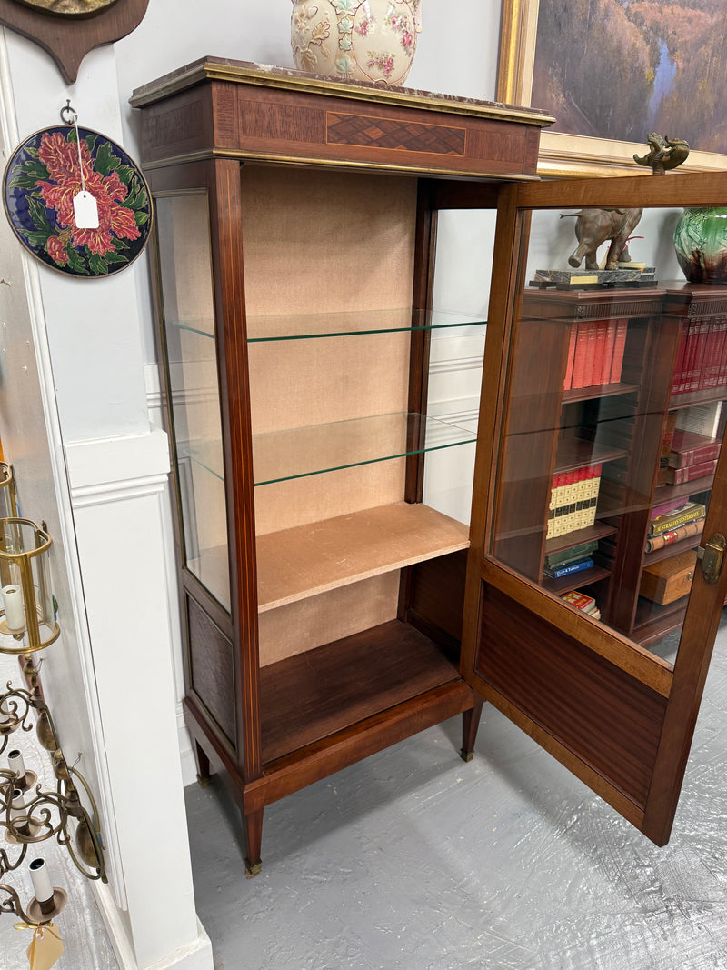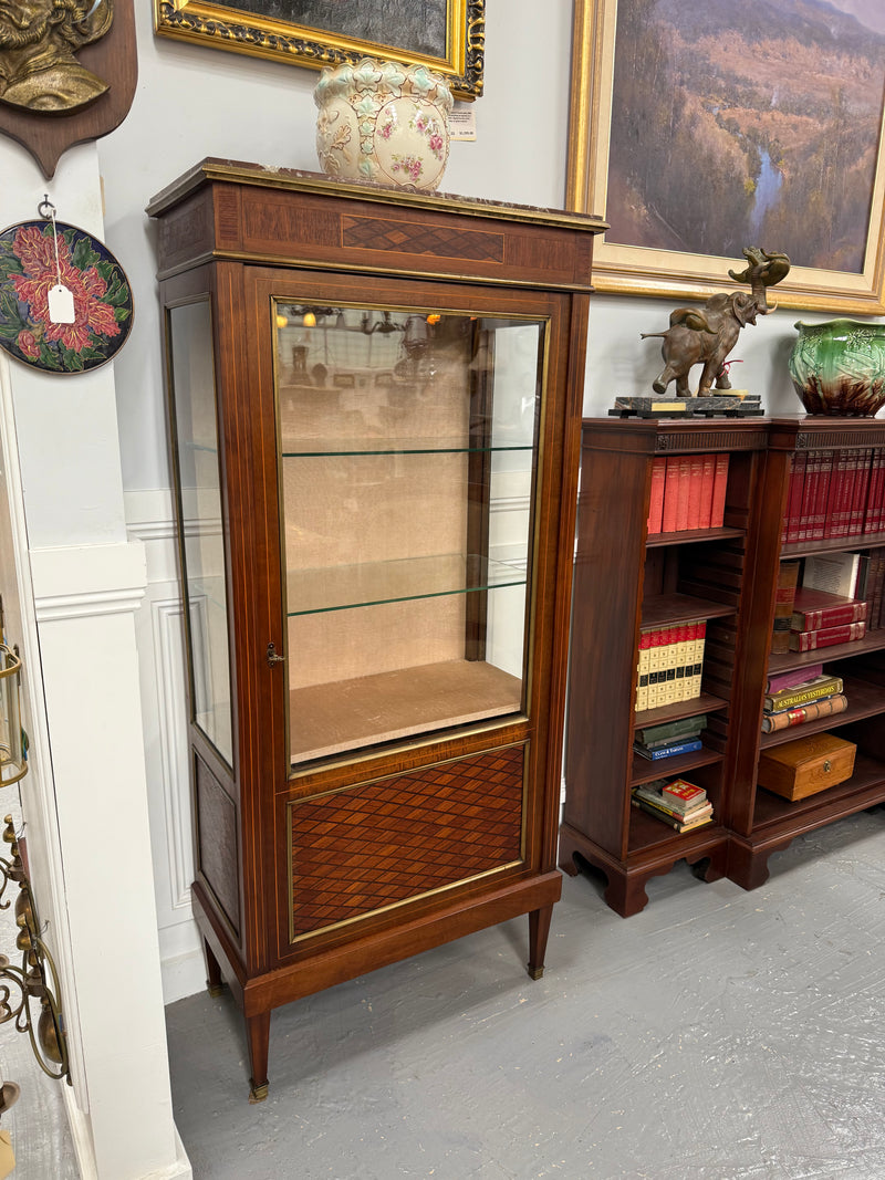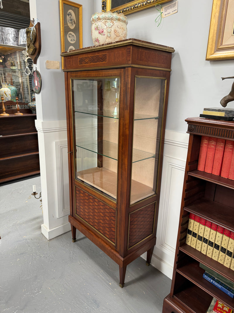 French early 20th Century Louis XVI style vitrine. Parquetry inlay with stringing and gilt metal trim. Interior is lined with velvet and has two glass shelves and there is an inset marble top. In very good original condition. Please see photos as they form part of the description and condition.