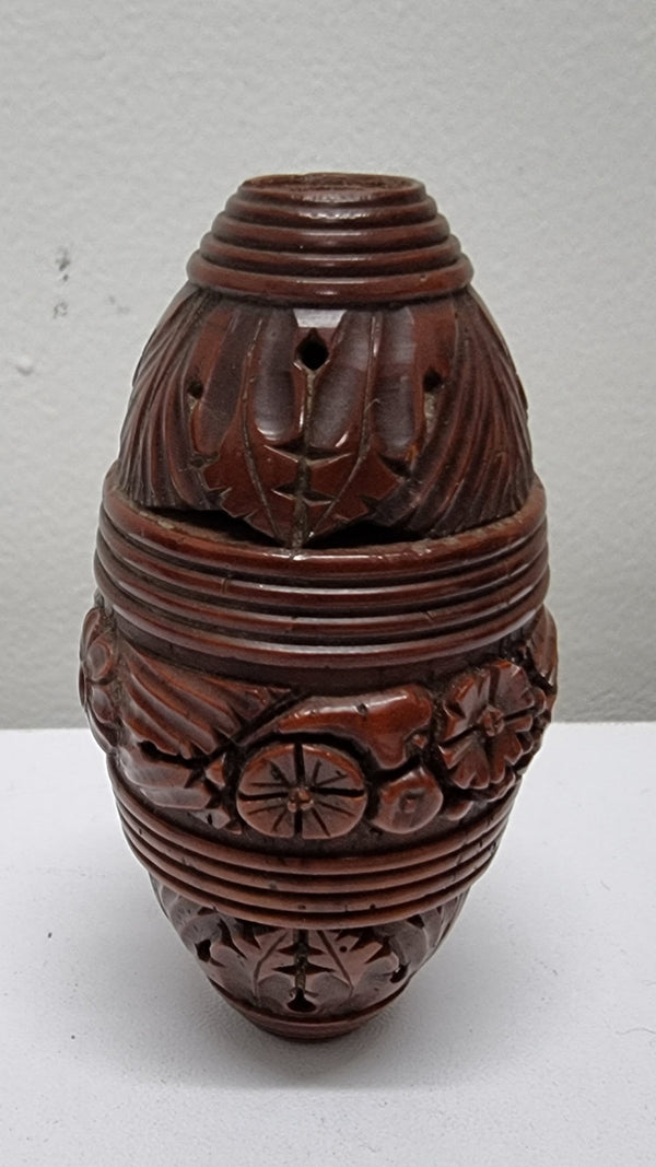 Victorian hand carved Coquilla nut egg secret box/ sewing case/ thimble holder. It is in good original condition and has been sourced locally. Please view photos as they help form part of the description.