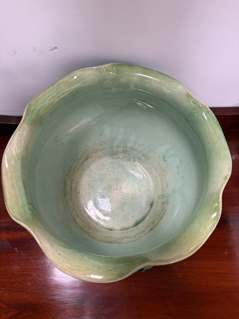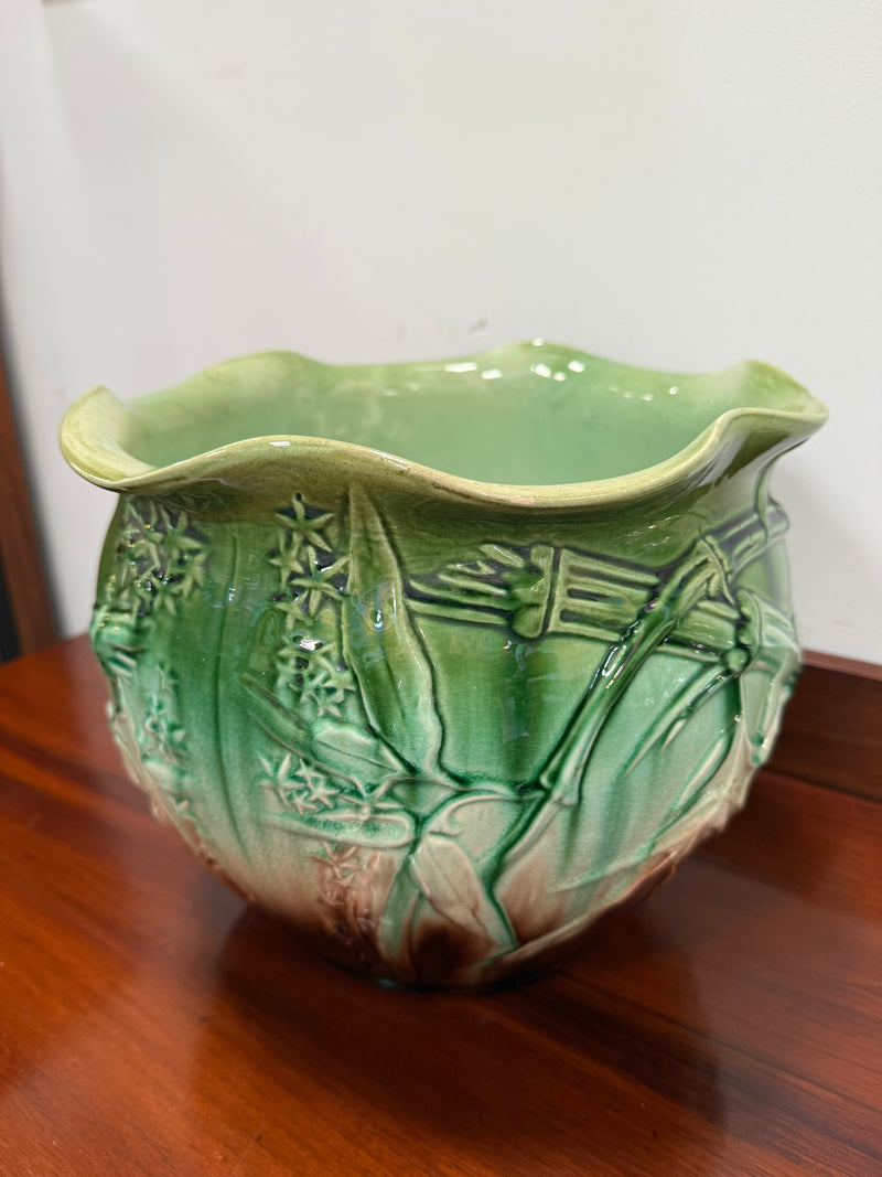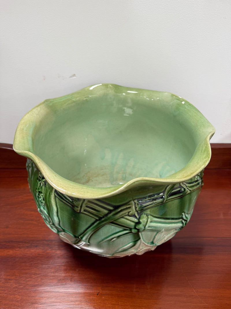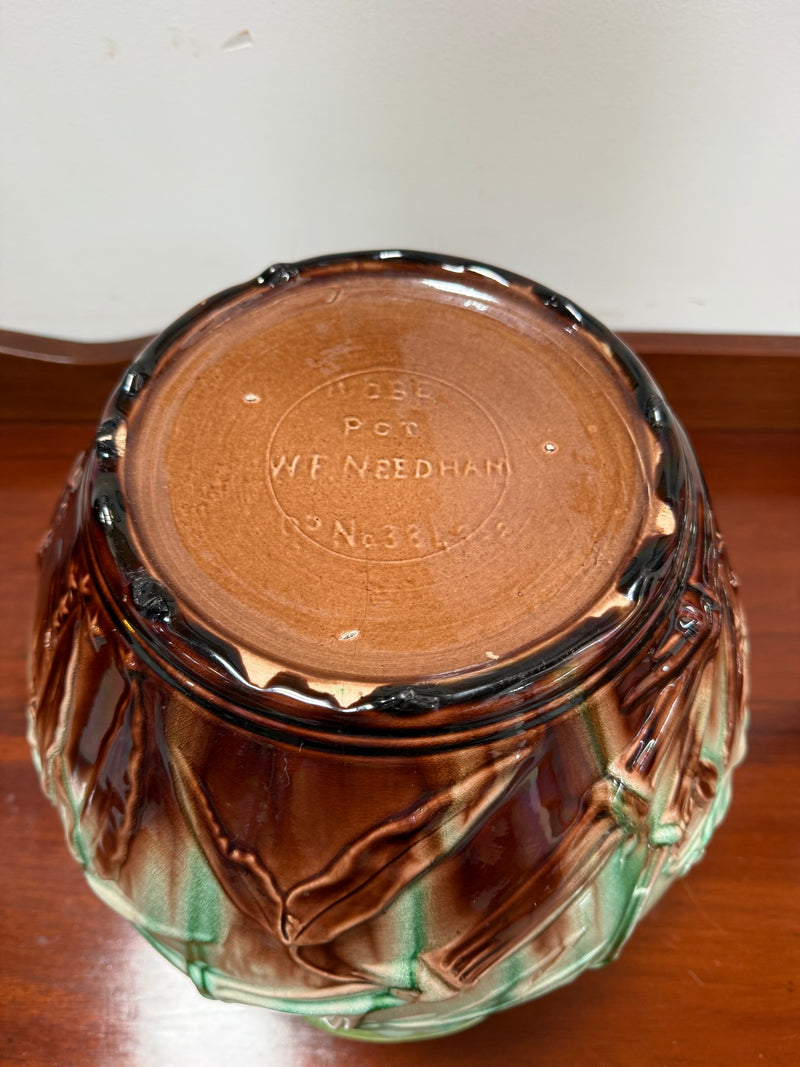 Green / Browwn coloured Bamboon patterned large mojolica jardiniere by W.F. Needham Potteries England. Small Hairline to Base. In as found condition. Please see photos as they form part of the description.