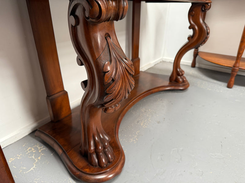 Victorian mahogany side table, single drawer and heavily carved front legs with stretcher base. In good restored condition. Please see photos as they form part of the description and condition.