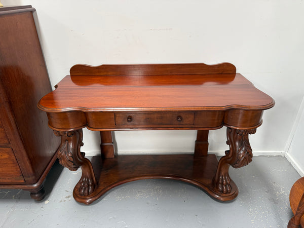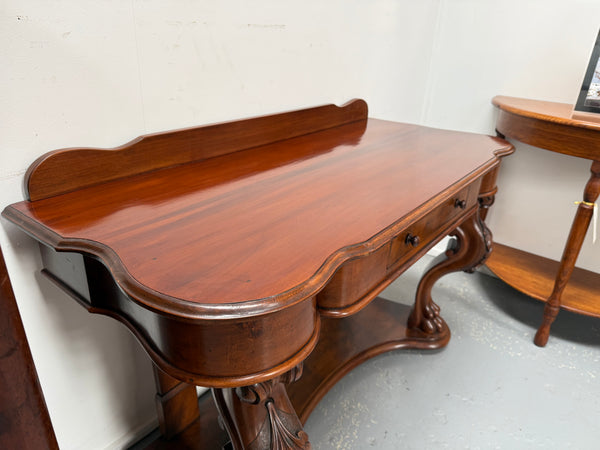 Victorian mahogany side table, single drawer and heavily carved front legs with stretcher base. In good restored condition. Please see photos as they form part of the description.