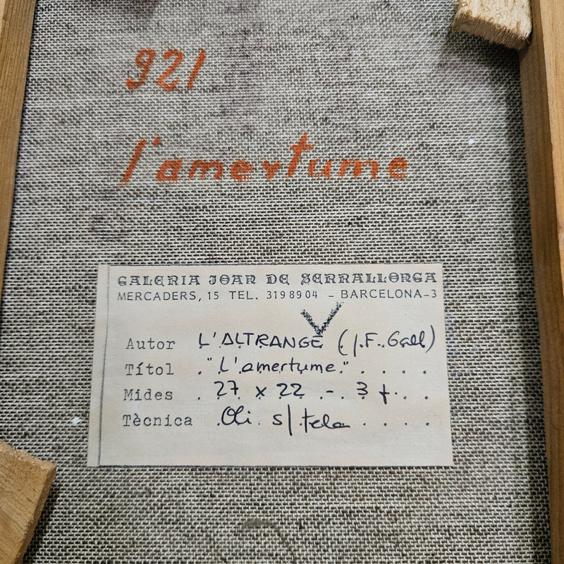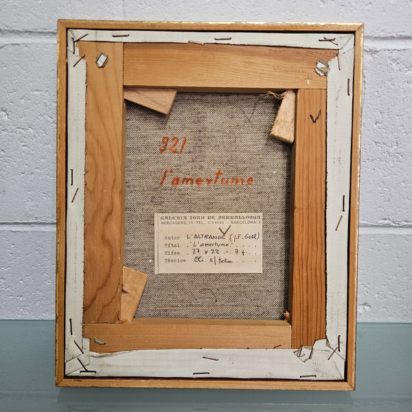 Vintage framed abstract oil painting Jean-François L'Altrange who is a French artist born in 1948 in Istanbul, Turkey. Original label on back and titled L'amertume. Canvas measures 27 X 22.3 cm. In good original condition. Please view photos as they help to form part of the description and condition.