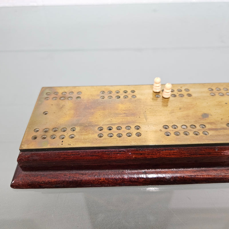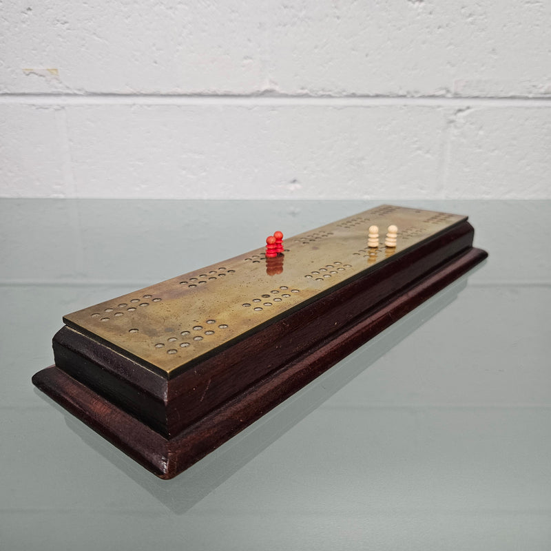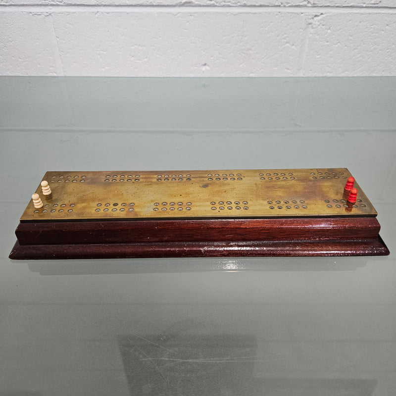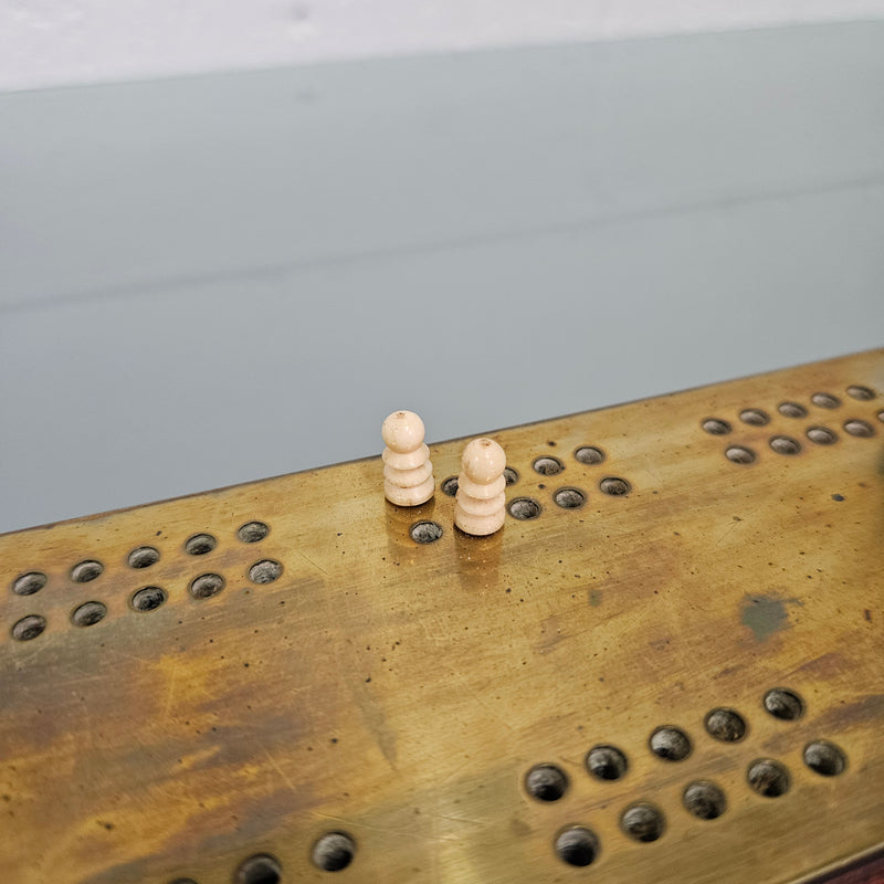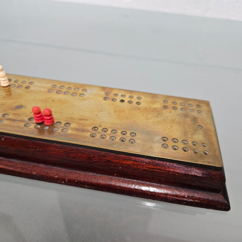 Vintage cribbage brass and timber board with two white and two red pegs. It is in good original condition. Please see photos as they form part of the description.