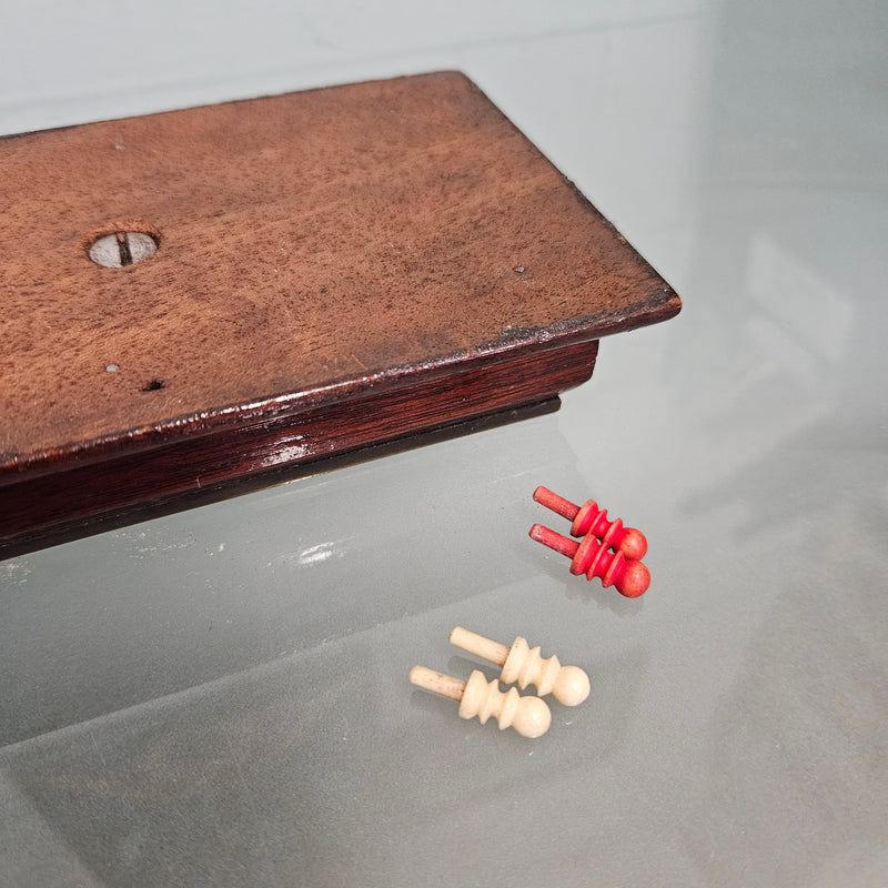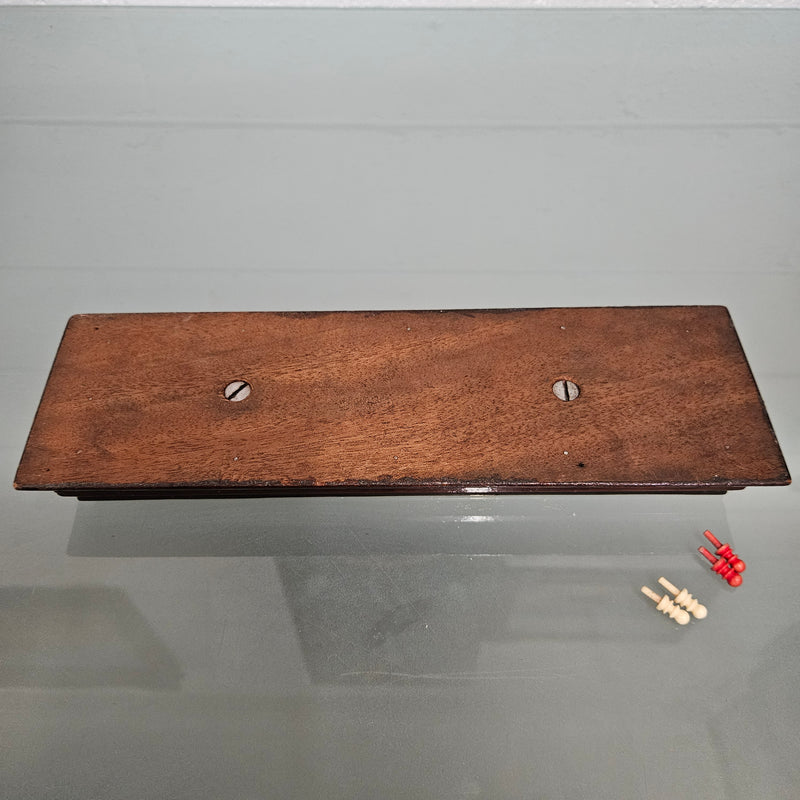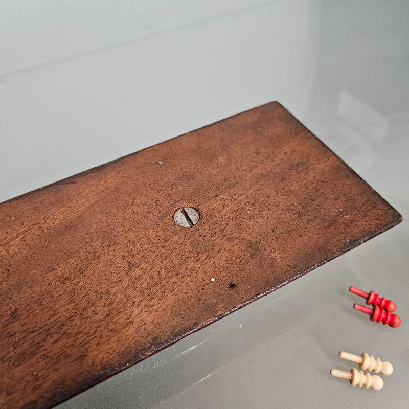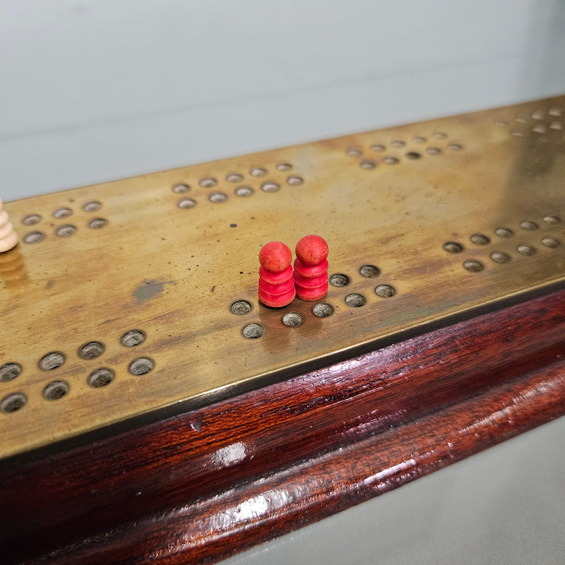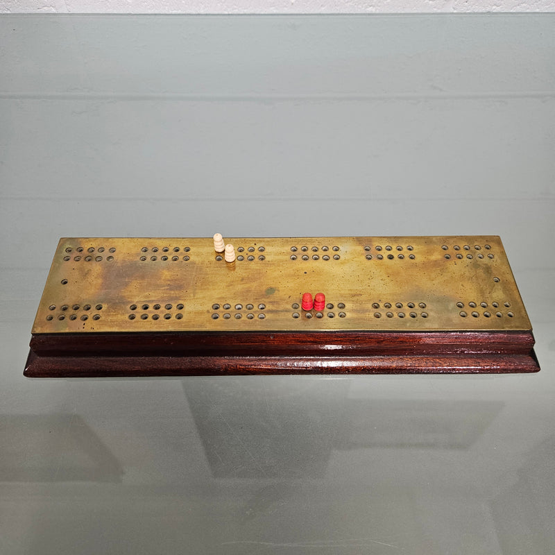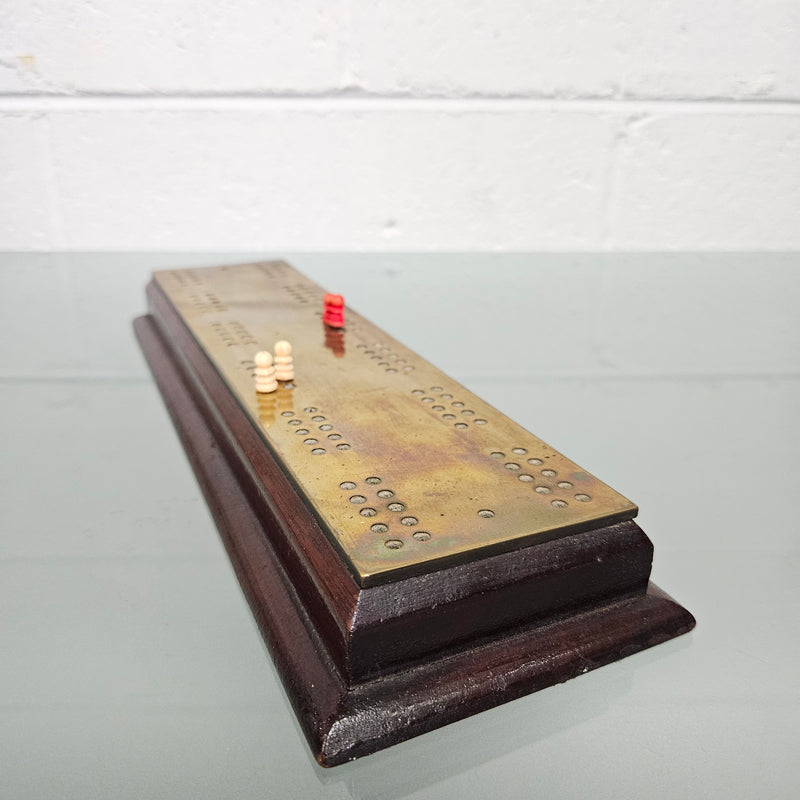 Vintage cribbage brass and timber board with two white and two red pegs. It is in good original condition. Please see photos as they form part of the description.