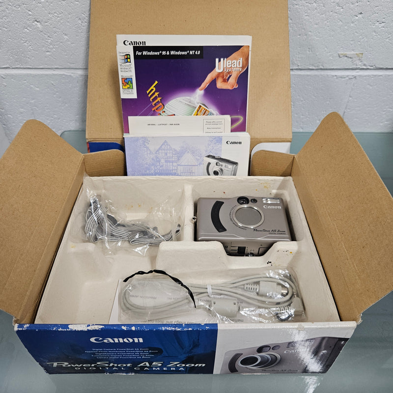 Vintage Canon A5 Power Shot 200 camera in box with literature. Not tested. In very good condition. Please see photos as they form part of the description.
