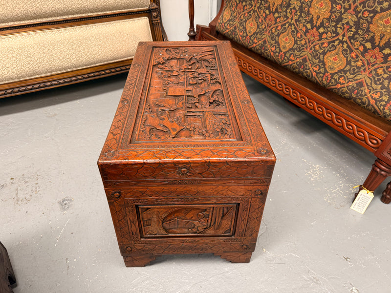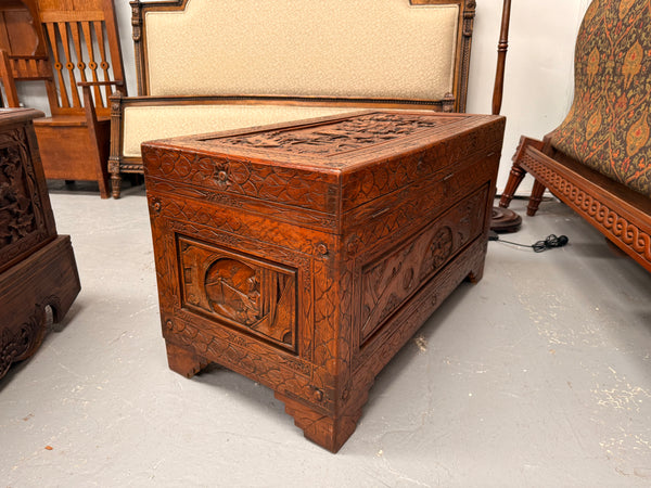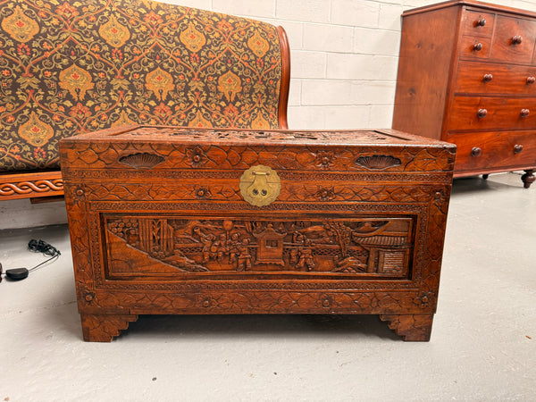Beautifully carved with oriental scene, vintage fragrant camphorwood chest with brass lock fittings. Circ: 1930's. In good original condition. Please see photos as they form part of the description.