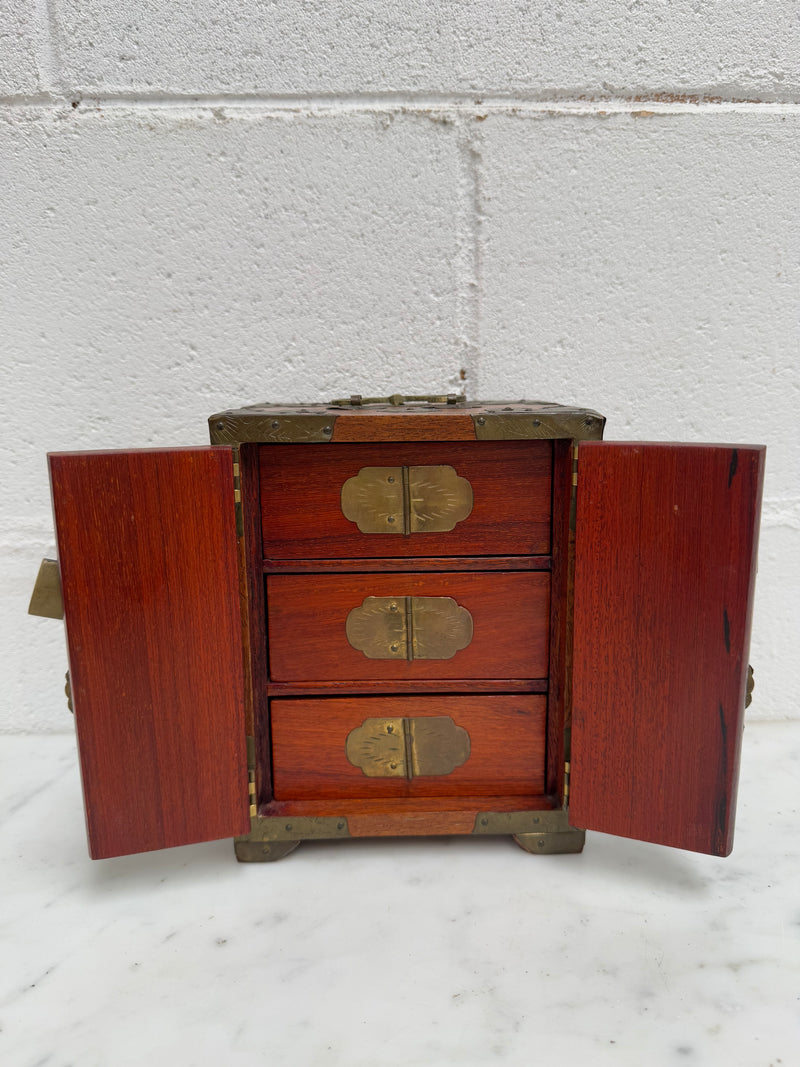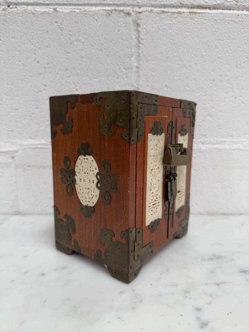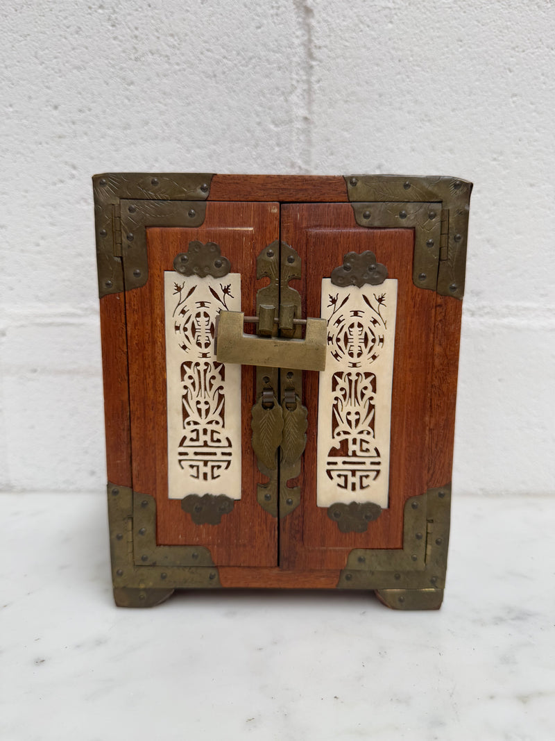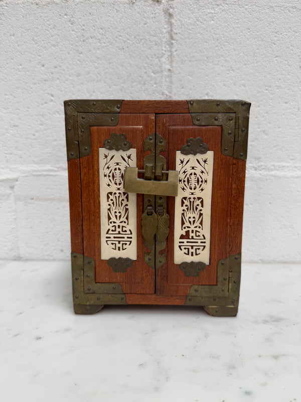 Stunning vintage Chinese Rosewood, carved bone and brass jewellery storage box, it has amazing details with three internal fabric lined drawers. It comes with an antique style lock to secure the box. It is in good original condition. Please see photos as they form part of the description.
