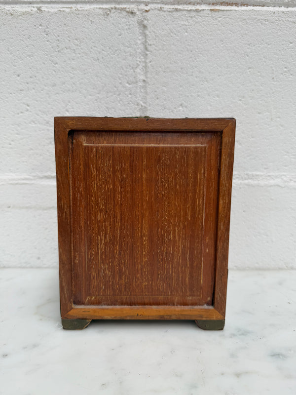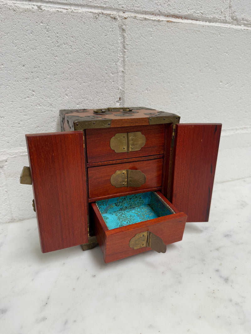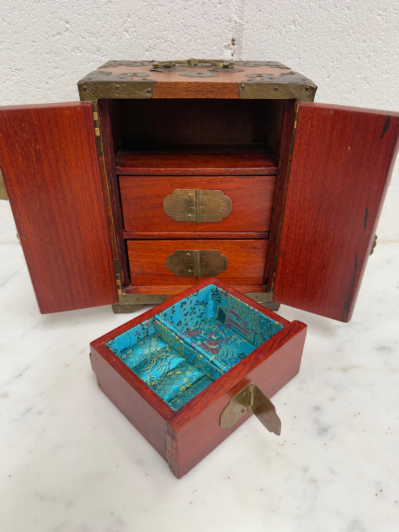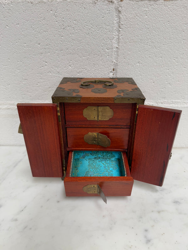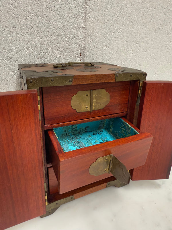Stunning vintage Chinese Rosewood, carved bone and brass jewellery storage box, it has amazing details with three internal fabric lined drawers. It comes with an antique style lock to secure the box. It is in good original condition. Please see photos as they form part of the description.