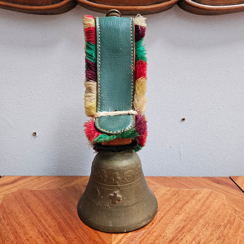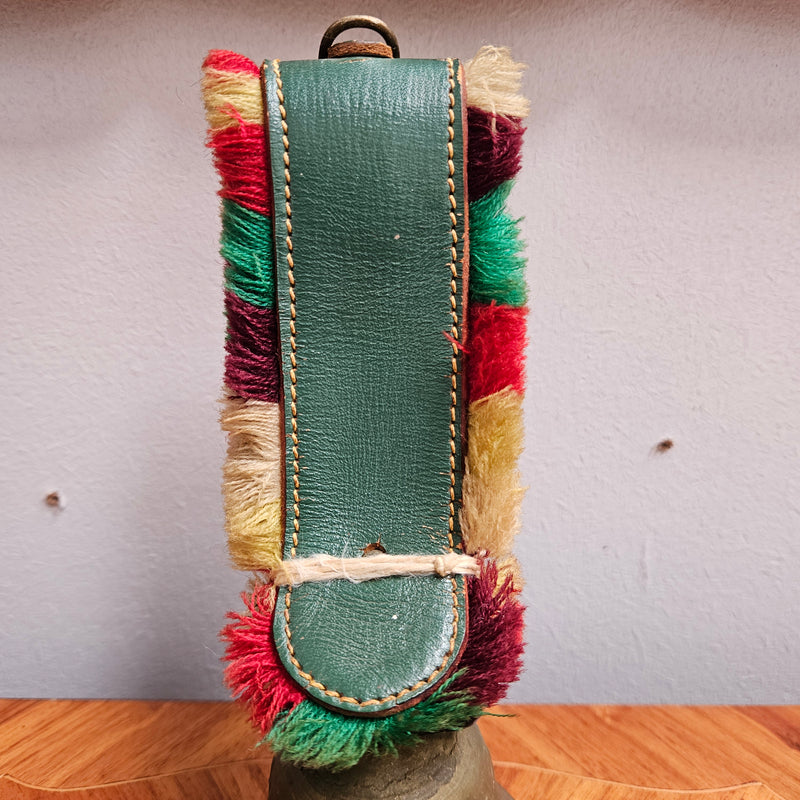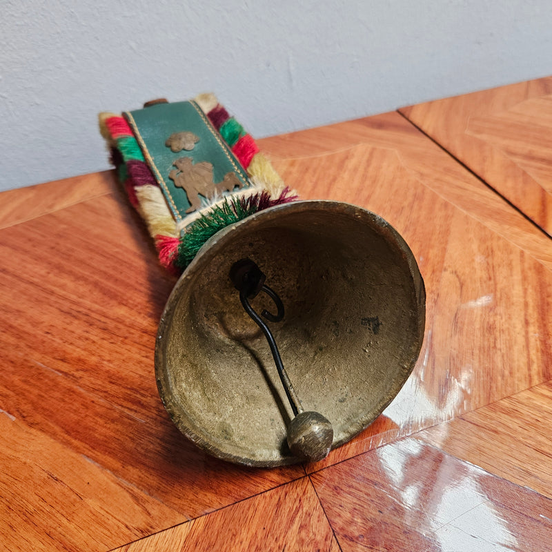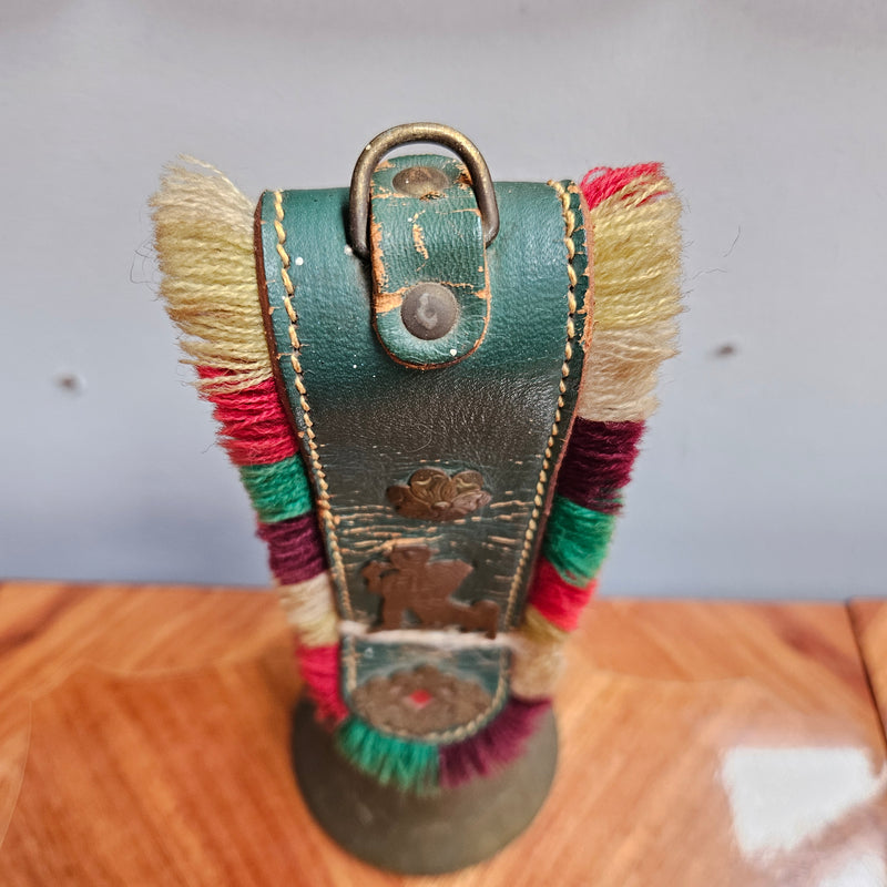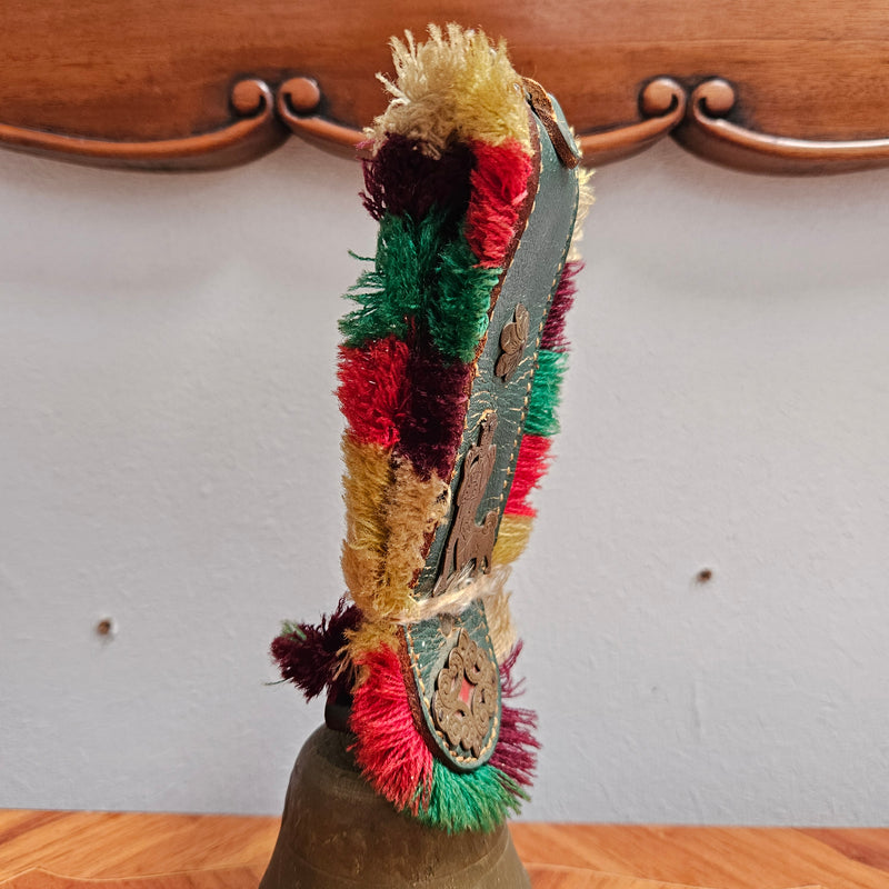 Vintage Cow or Goat Brass Bell with colorful fringed leather strap. In good condition. Please see photos as they form part of the description.