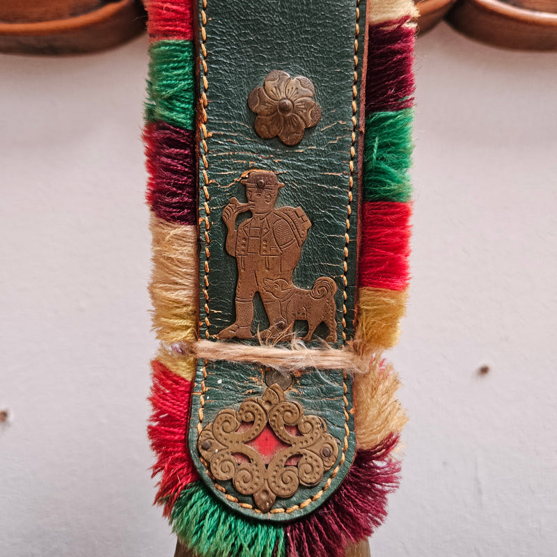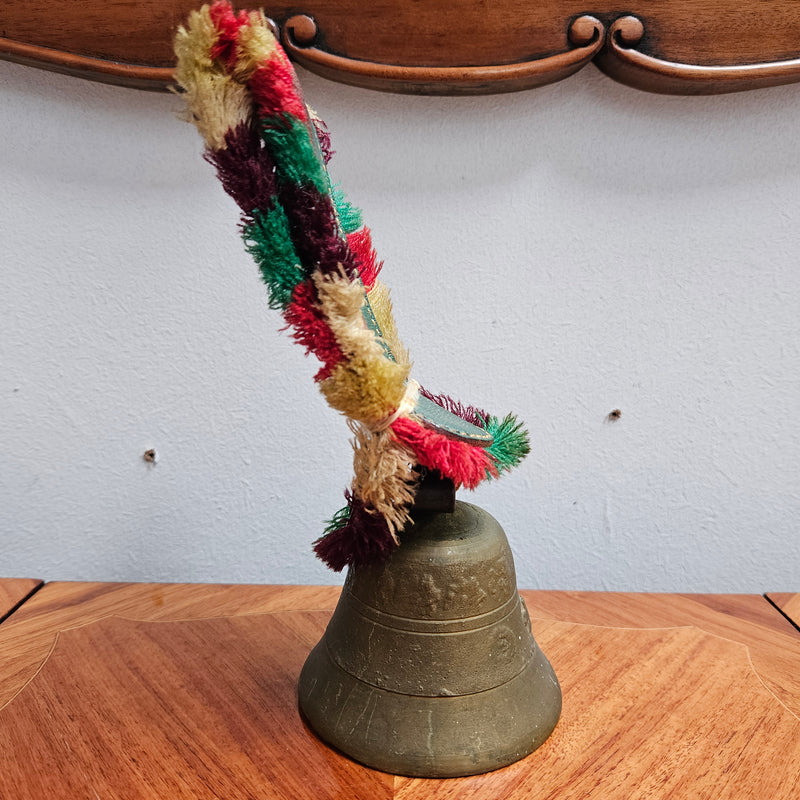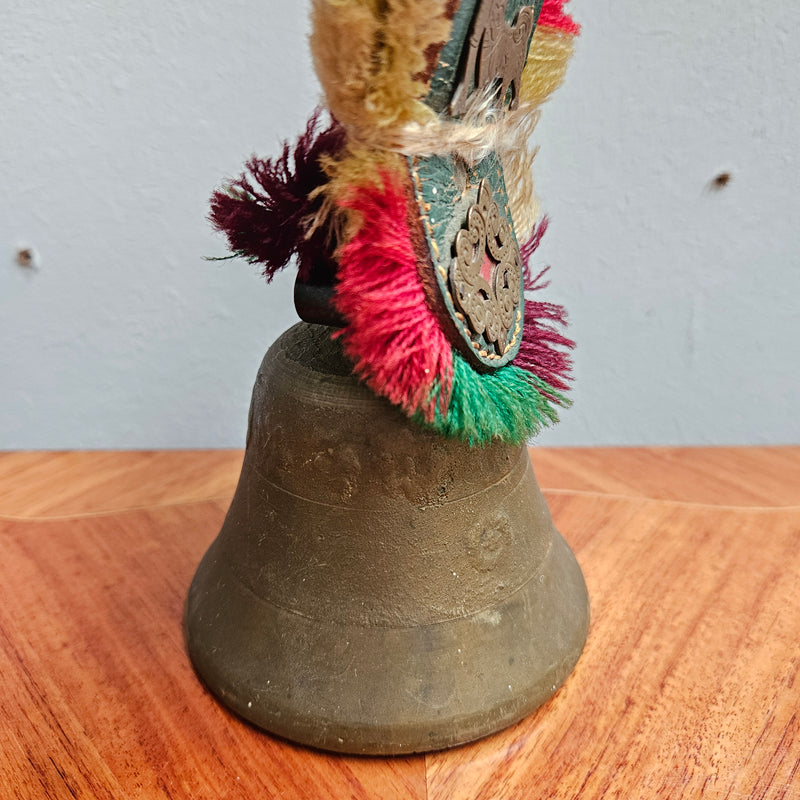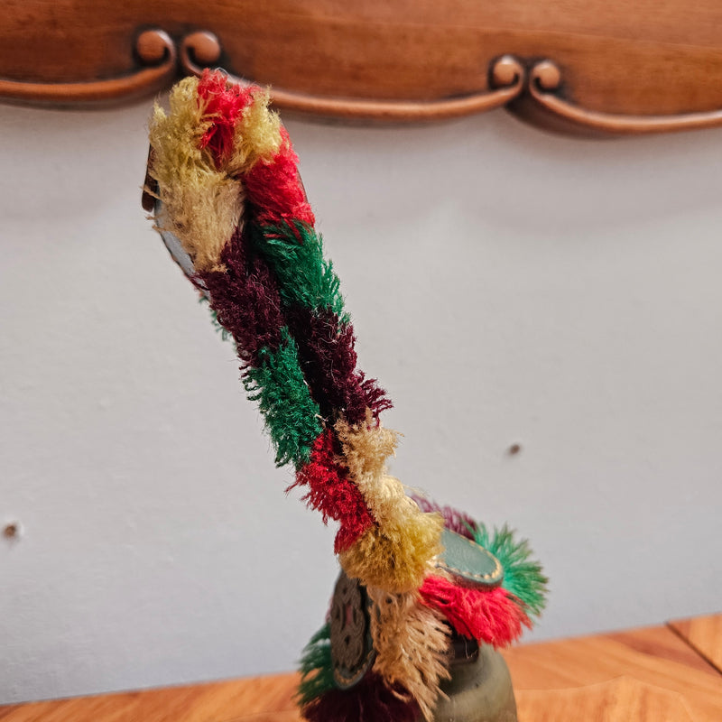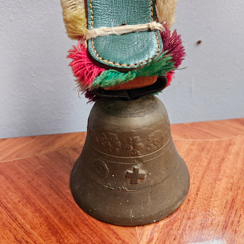 Vintage Cow or Goat Brass Bell with colorful fringed leather strap. In good condition. Please see photos as they form part of the description.