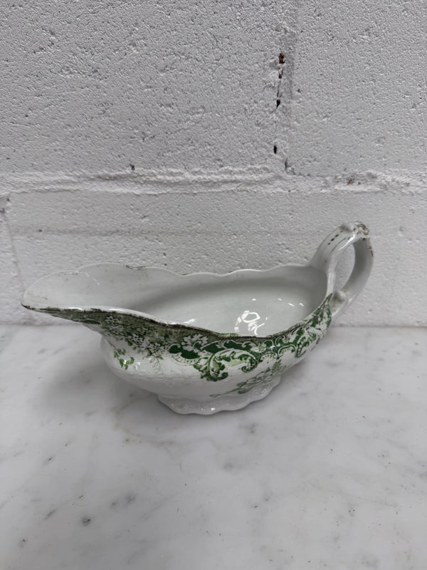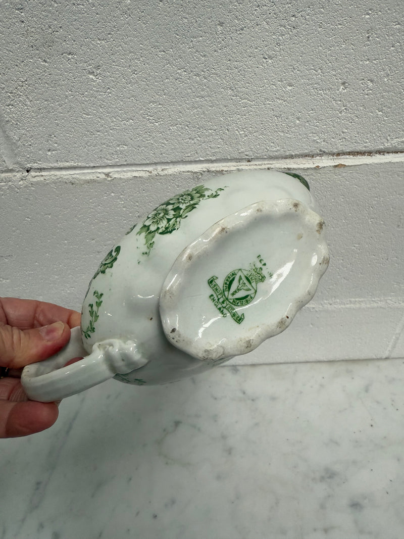 Vintage made in England Bishop and Stonier green and white gravy boat with handle, it is in good original condition, there are some fading to the green design. Please see photos as they form part of the description.