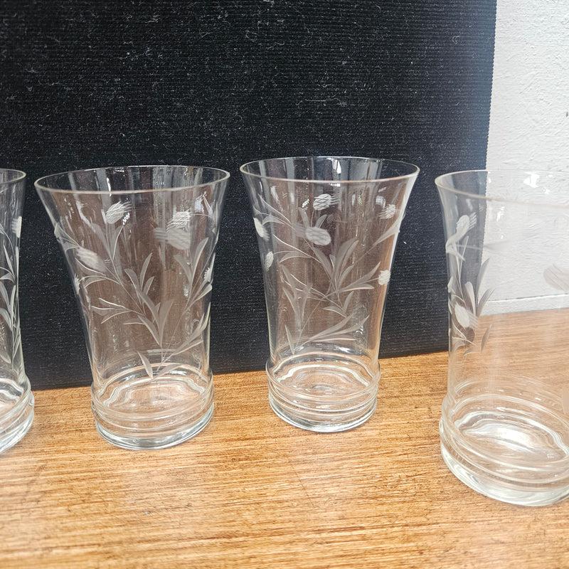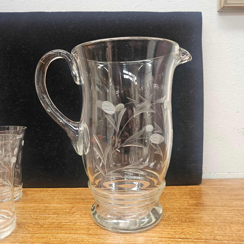 Lovely vintage floral etched glass lemonade/water drinking set with large capacity jug and six glasses. This set is in good original condition with no chips or cracks. Please see photos as they form part of the description.