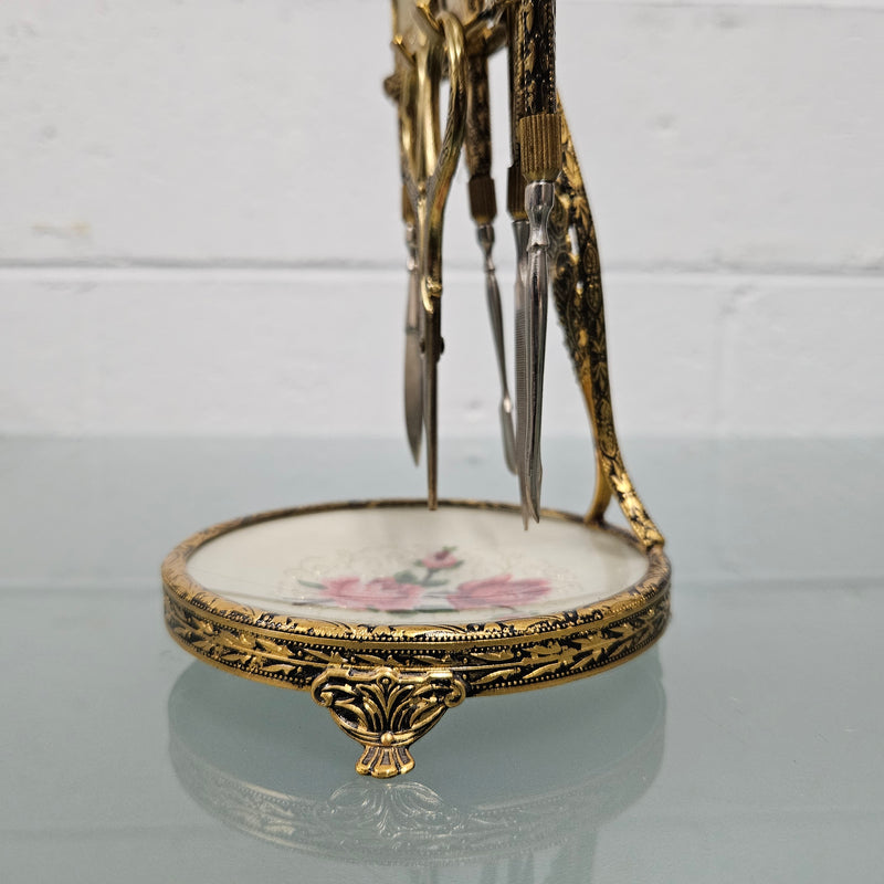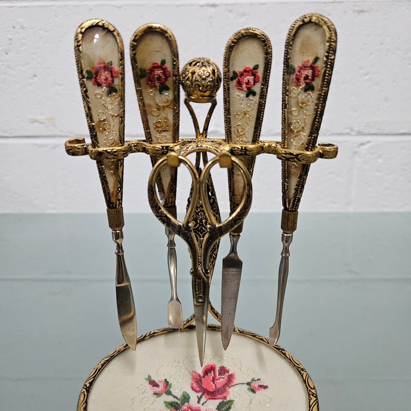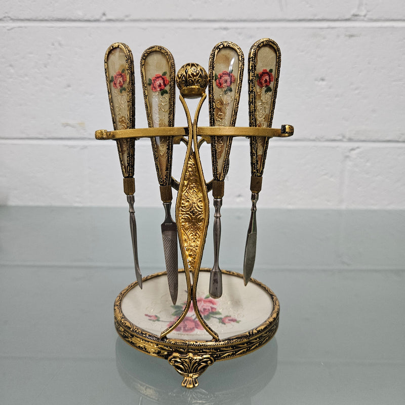 Stunning ornate brass and petit point five piece manicure set on lovely detailed stand. It is hard to find and in good original condition. Please see photos as they form part of the description.