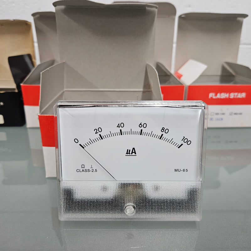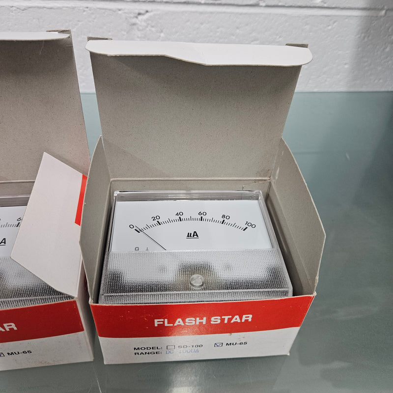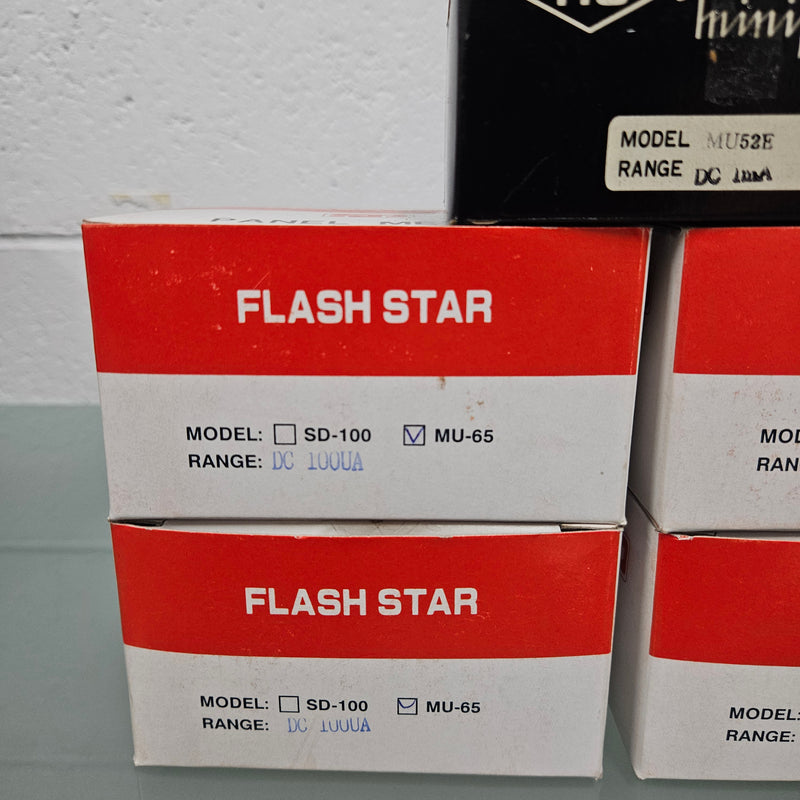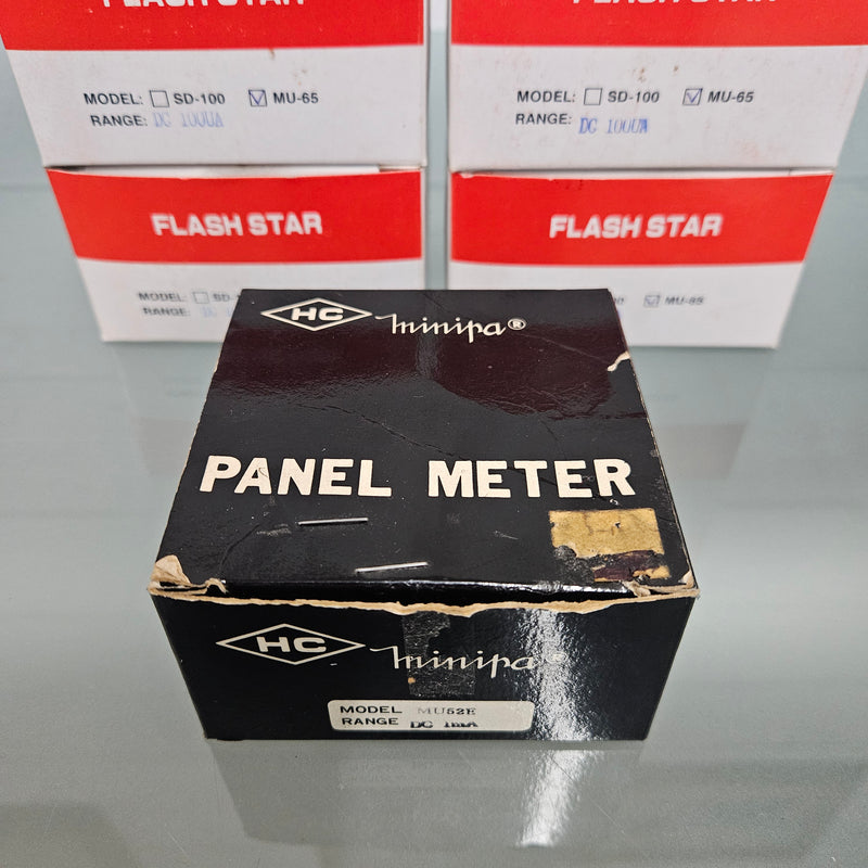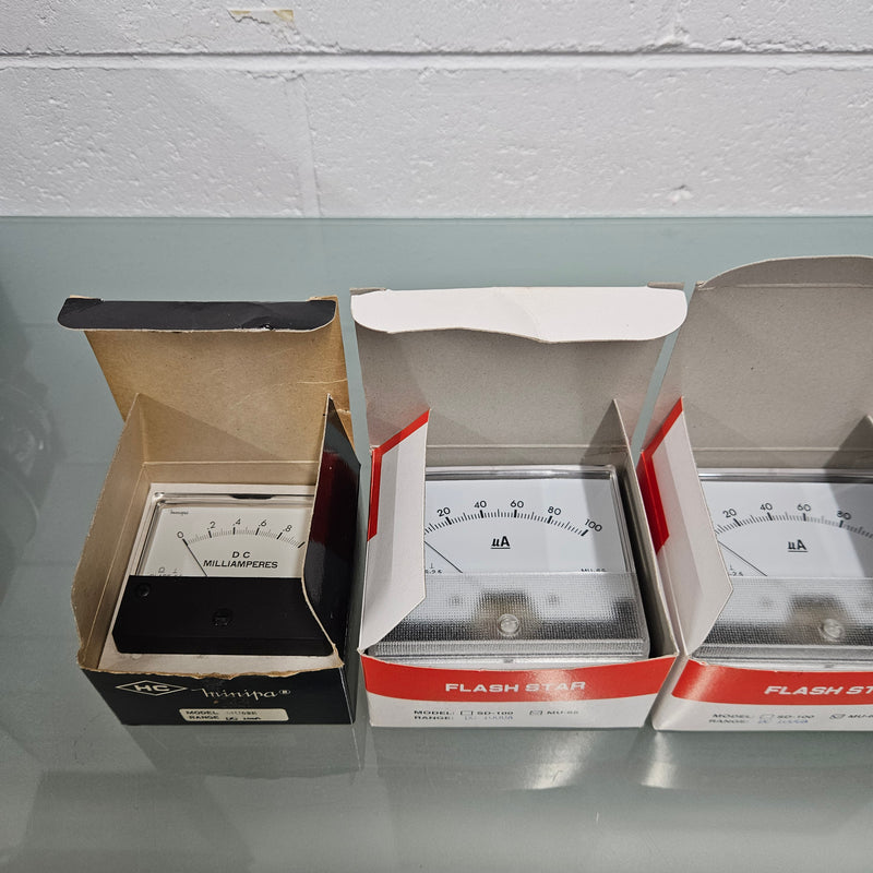 Vintage panel Current analog meter, in original box. There are four in total, all sold separately. They all looked to be unused and in good condition. Please see photos as they form part of the description. There are 4 Flash Star brand meters and 1 HC Minipa brand Meter.